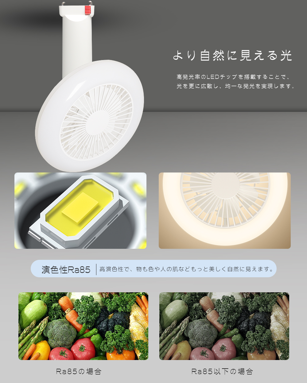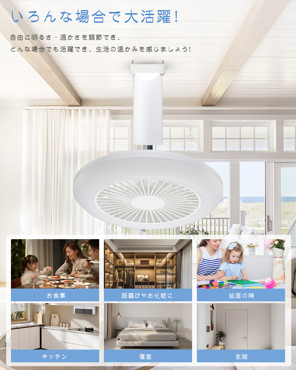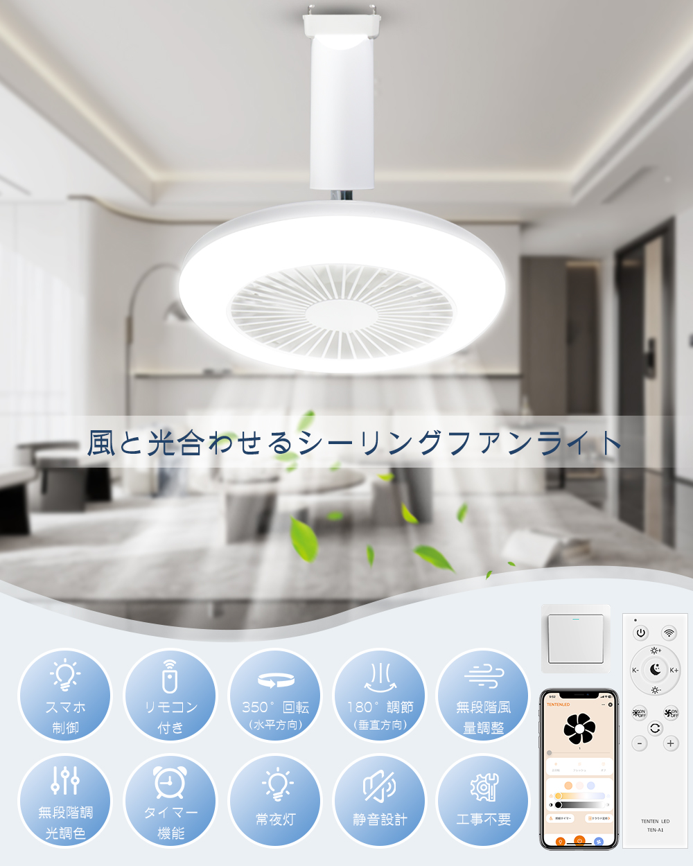| 一台二役、光&風一体化 | LEDファンライトは「ファン」と「LEDライト」を組み合わせたシーリングファンライトです。天井に設置することで風と光をお届け!循環効率がアップし、足元に置かないので邪魔にならず小さなお子様やペットがいるご家庭に最適!お部屋の空気をしっかり循環し、温度差を解消する同時、居心地の良い雰囲気を作り出す快適に。 |