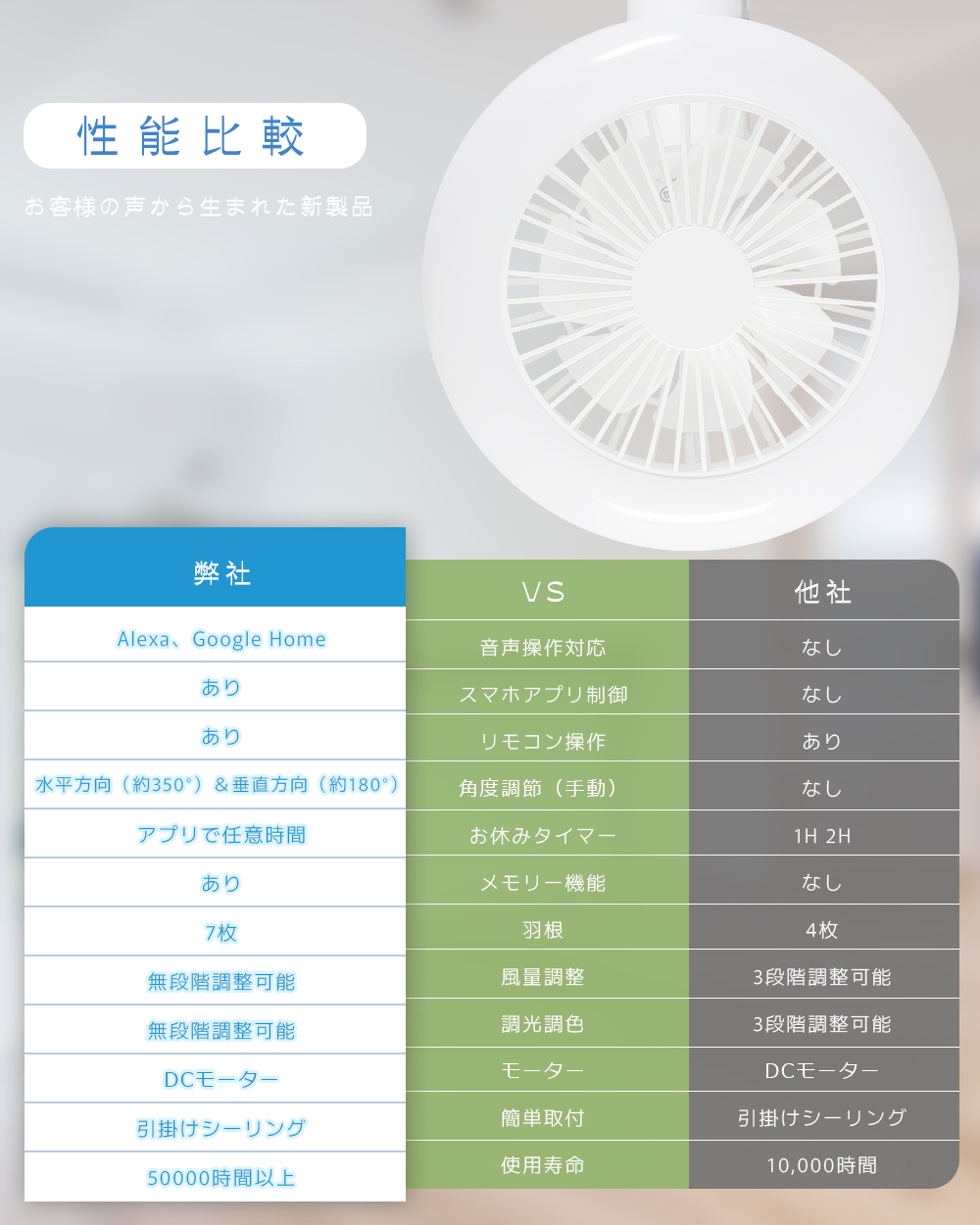 | 音声操作&アプリ対応! | 通常モデルと同様にリモコンがついているほか、スマートフォンアプリ「Wi Home」・Alexa・Google Homeで操作できます。AlexaやGoogle Homeの音声コマンドだけで操作できるので、手を使わずとも「ファンをオンにして」と声に出すだけで、オンにしたりできます。もちろんリモコン操作にも対応しているので、通話等でスマートフォンが使用中の時でも安心です。 |