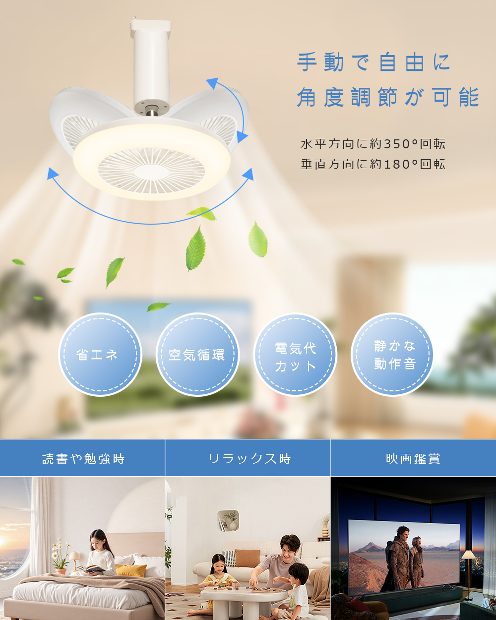 | 手動で自由に角度調節が可能 | 水平方向約350°・垂直方向約180°まで手動で角度調節が可能なシーリングファンライトです。自由自在に角度を設定できるから、熱のこもるコンロ前など風の向きを設定できます。 |
