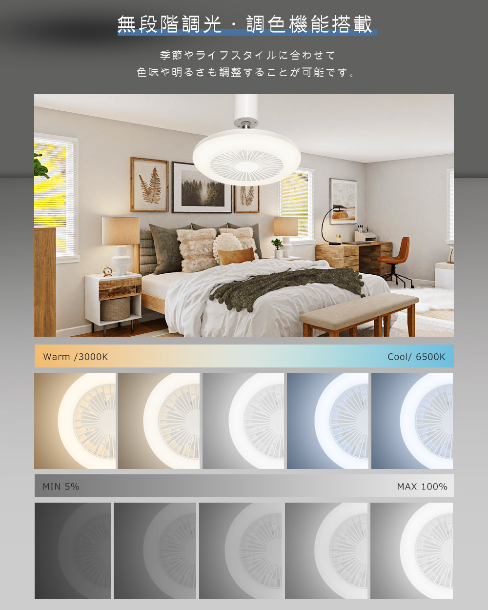 | 無段階調光調色 | 無段階(0〜100%)のLED調光調色機能が搭載されております。 環境と雰囲気によってご希望な光度と色温度はご自由に調節できます。 また、色温度は暖色から昼光色まで自由に調節できます。 |