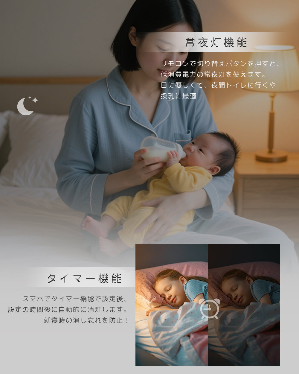 | タイマー、メモリ、常夜灯機能 | 就寝時や外出時に自動的に運転を操作してくれ安全安心!メモリー機能が搭載されたので、オフする直前の状態が再現されます。リモコンの「常夜灯」スイッチを押すと、低消費電力になります。真っ暗だと眠れない方にも安心の常夜灯付きます。一人寝て始めたばかり子供の部屋また夜間授乳に最適!個人や家族の好みや日常的なニーズに対応可能! |