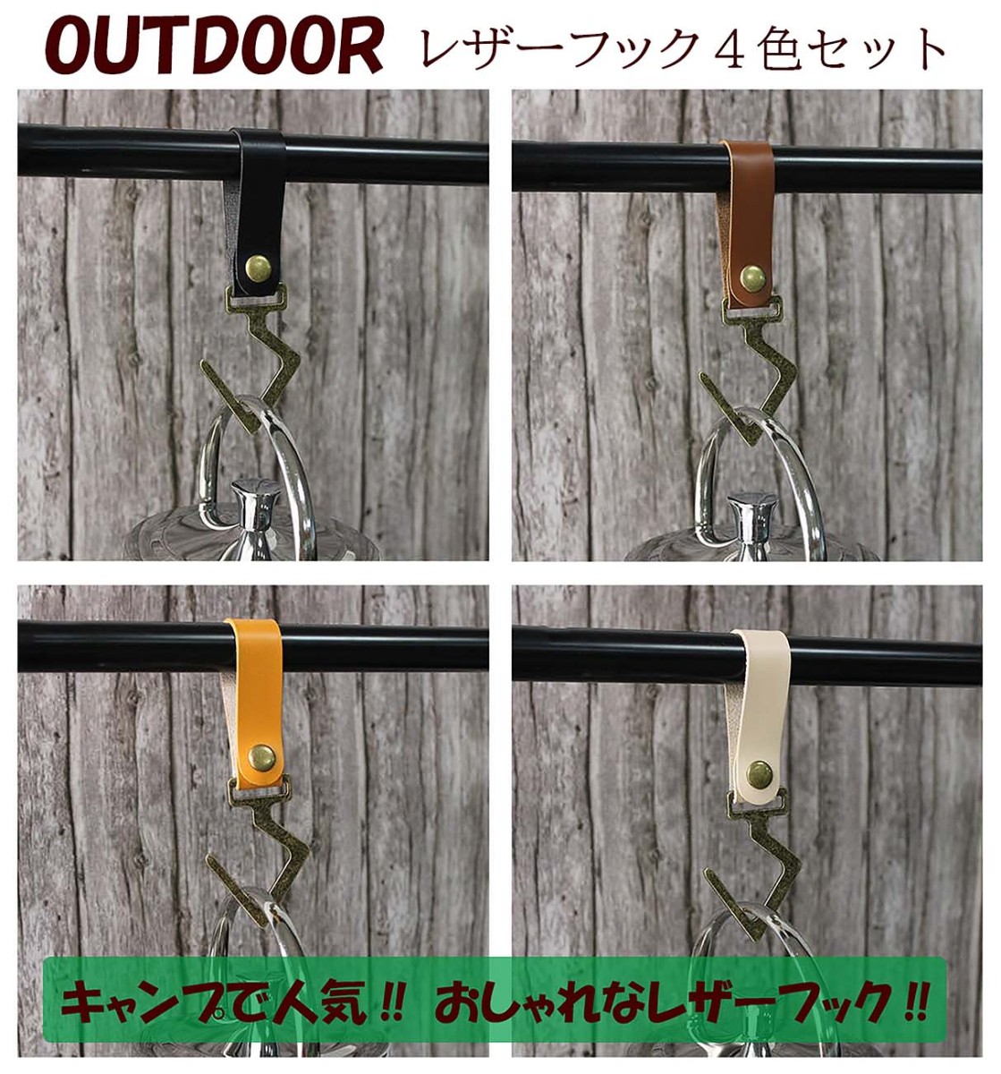 レザーフック ハンガー 4個セット 4色セット ハンギングラック バックル S字 キャンプ おしゃれ アウトドア カナビラ ランタンフック