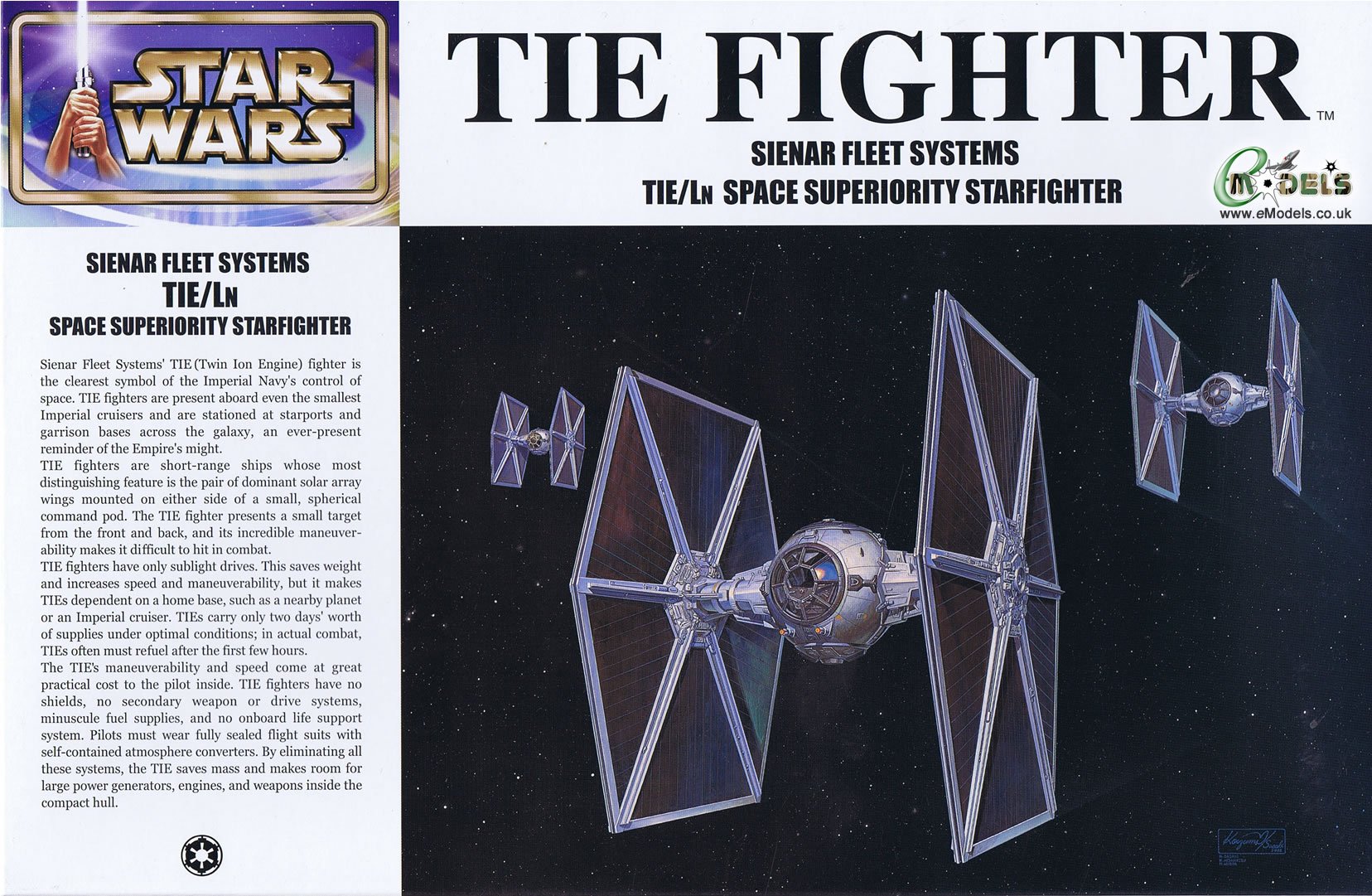 帝国軍の主力戦闘機として、帝国の支配の象徴的存在となっているのがタイ・ファイターである。特徴的な2枚の巨大なソーラーパネルから供給されるエネルギーで2基のイオン推力システムを駆動。防御シールドなどの不要な装備を徹底的に取り除き、軽量コンパクトにまとめられた機体と相まって極めて優れた機動性を発揮する。ルーカスフィルム社監修のもとモデル化。パイロットフィギュアの座像とストームトルーパー立像の2体付属。コクピット内も精密再現。スタンド付き。透明パーツ用に、切りとり線を印刷したマスキングシート付き。