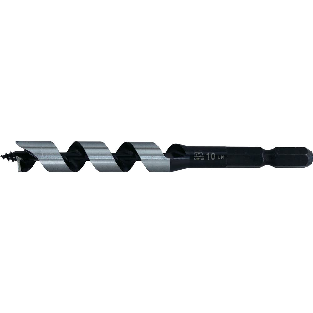 適用材<br>一般木材<br><br>特長<br>ドリル先端が先ネジ(誘導ネジ)タイプ(A型)で、回転力によりネジが被削材に引き込んでいくため、推力(押す力)を与えなくてもスムーズな穴あけ作業が行える<br>浅穴を高速で正確に穴あけが行える<br><br>材質<br>普通鋼<br><br>寸法(mm)<br>全長100×ネジ丈60×軸径6.35(六角軸)<br><br>適用機種<br>電気ドリル・インパクトドライバ(19mm迄)<br><br>適正回転数<br>3,000回転/分以下<br><br>A型は浅い貫通穴向きです。<br>止め穴、ボール盤での穴あけには先三角タイプがお勧めです。