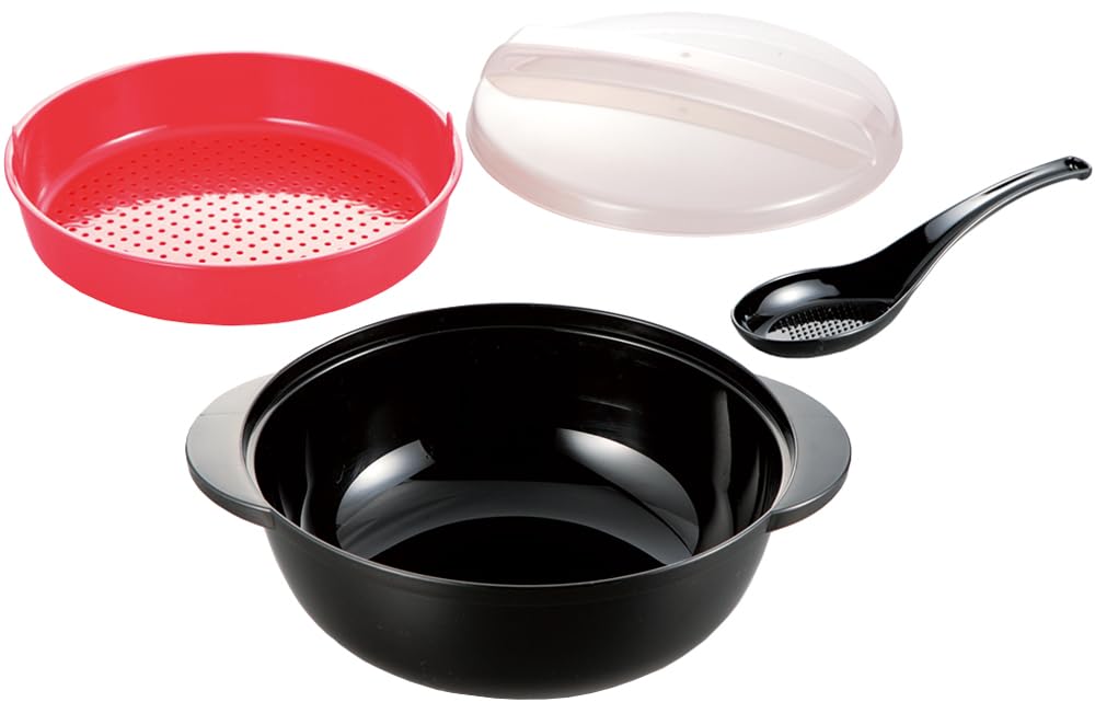 素材・材質:本体・ザル/耐熱ポリプロピレン、フタ/ポリプロピレン、レンゲ/AS(アクリロニトリル・スチレン)樹脂