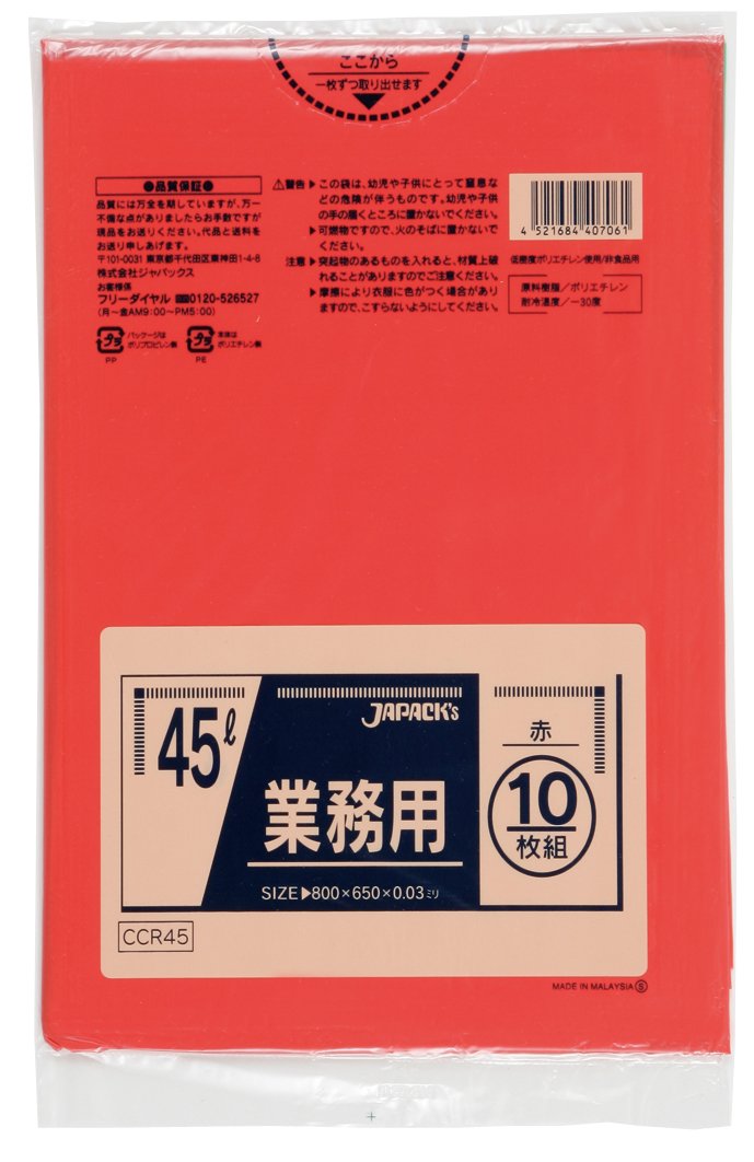 ジャパックス ゴミ袋 赤 縦80cm×横65cm×厚さ0.03mm 45L スタンダードポリ袋 カラータイプ CCR45 10枚入