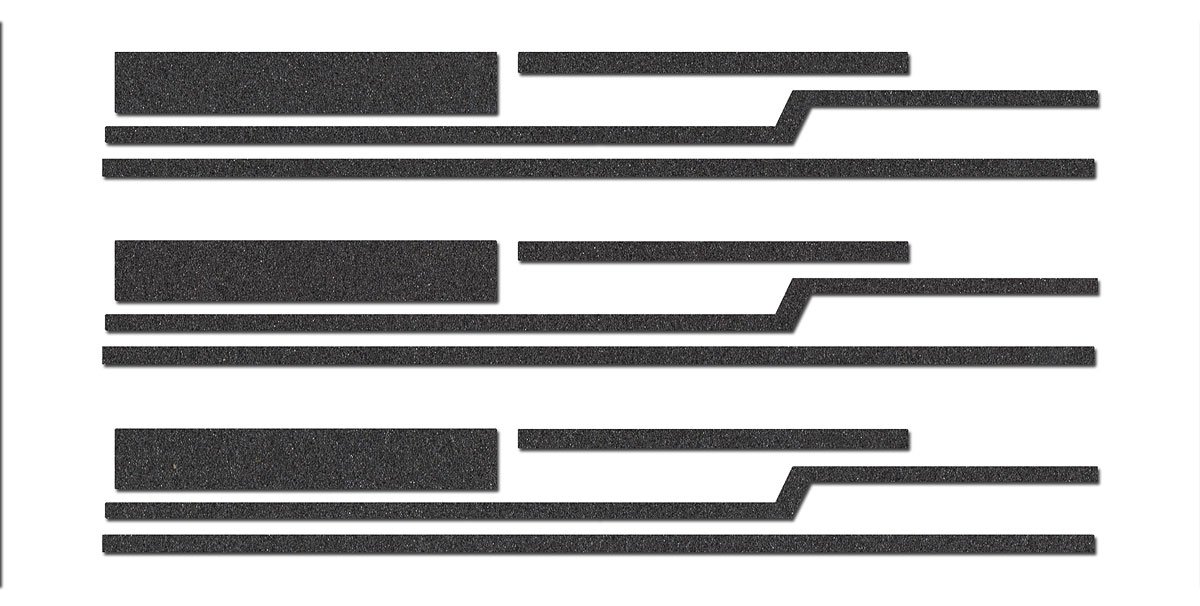 1. 古いモルトを付属の竹串などで剥がしてきれいにします。 2. アルコールやベンジンを綿棒に浸してこすり、貼る部分の汚れを落とします。 3. 新しいモルトを台紙から剥がします。 4. 粘着面にアルコールか水を塗ります。アルコールか水で粘着面が湿っている間は、テープの粘着力が一時的に落ちますので、位置あわせと貼り直しがやりやすくなります。 5. 溝の上にだいたいの位置あわせをしてモルトを置きます。 6. マイナスドライバーや先を平たくした竹串などでモルトが転けないように押し込んでいきます。アルコールか水が乾く前なら、貼り直しが効きますので、落ち着いて作業をしてください。 3台分入っておりますので、2回は練習する事ができます。失敗しても3回目にはきちんと貼り付けられるはずですので、安心です。