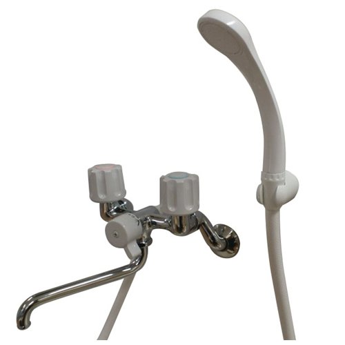 ツーハンドルタイプのシャワー付き混合栓です。 シャワヘッドは約30%節水できるタイプ。しかも軽量で持ちやすい。 節水シャワー付き 偏心管取り付け可能幅:120mm~220mm パイプの長さ:170mm