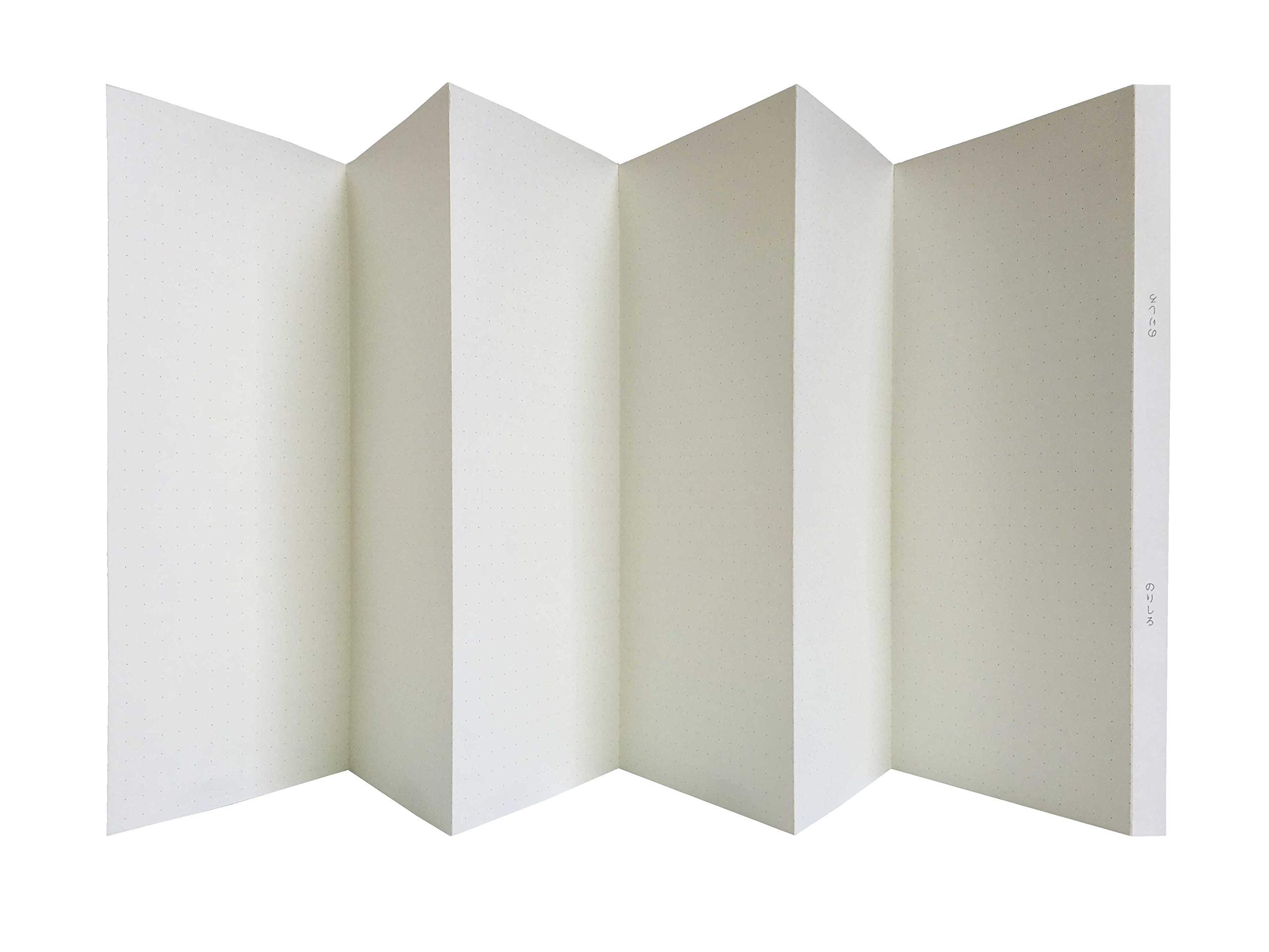 【頁数】1枚あたり蛇腹折り12頁(表面6頁、裏面6頁) 【ドット方眼】4.75 [mm] (グレー色) 【寸法】<新サイズ> W76・H182 [mm] ×蛇腹折り6面 + のりしろ10 [mm](全幅466 [mm] ※のりしろ含) 【紙厚】127.9g/m2 【質量】1枚あたり約11 [g] 【用紙特徴】薄いクリーム色・高平滑・非塗工 【入数】5枚 【その他】※専用ブックカバー(ホルダー)は別売