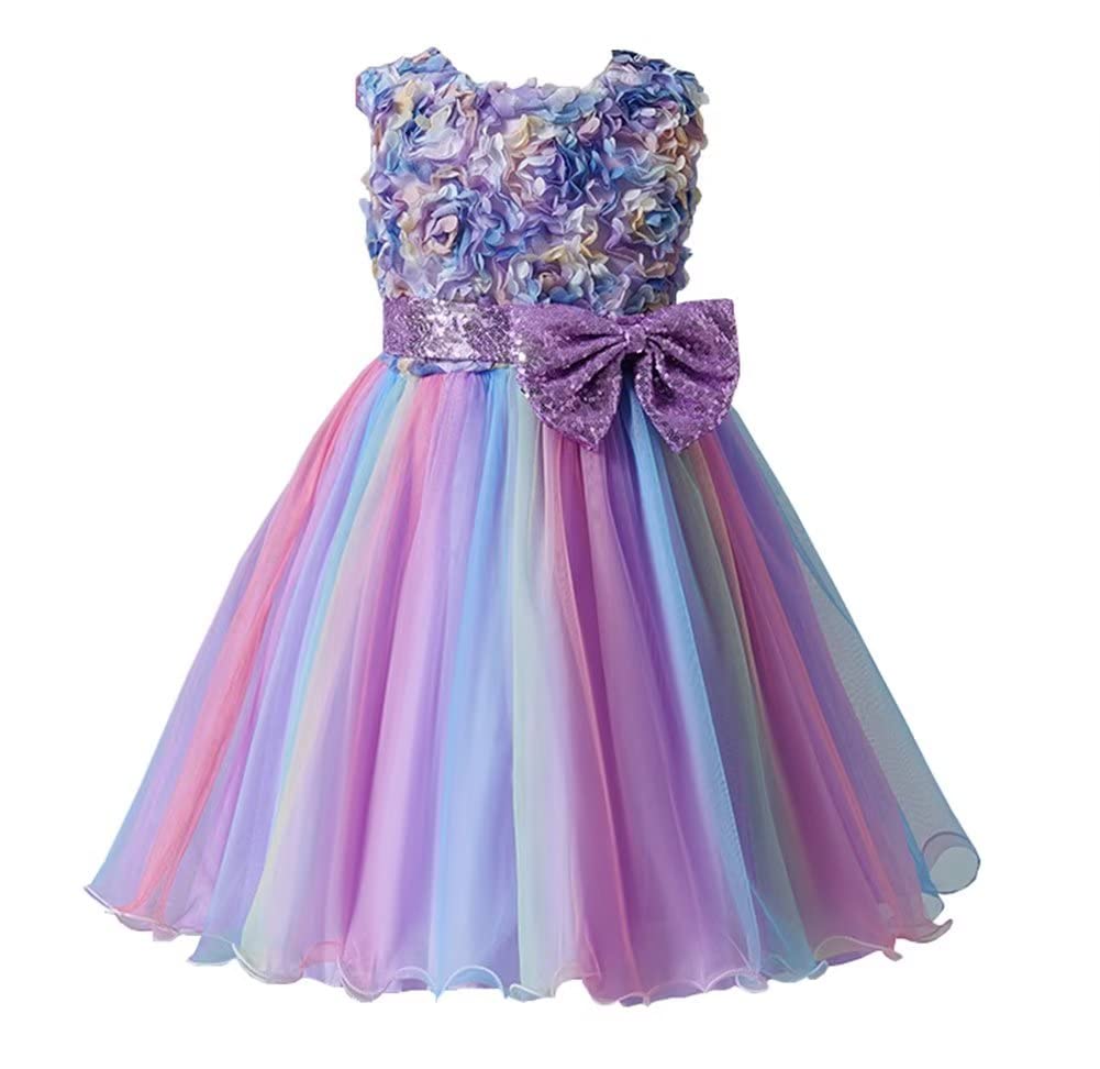 [Kayiyasu] ドレス 子供 ピアノ 発表会 入園式 女の子 虹色 スパンコール蝶結び 花柄 丸ネック フォーマル 卒業式 ガールズ 誕生日 3