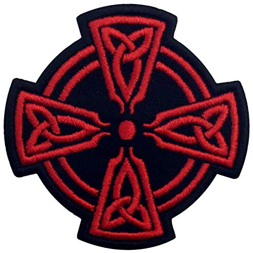 ケルト十字サークル刺繍入りアイロン貼り付け/縫い付けワッペン, 赤、黒