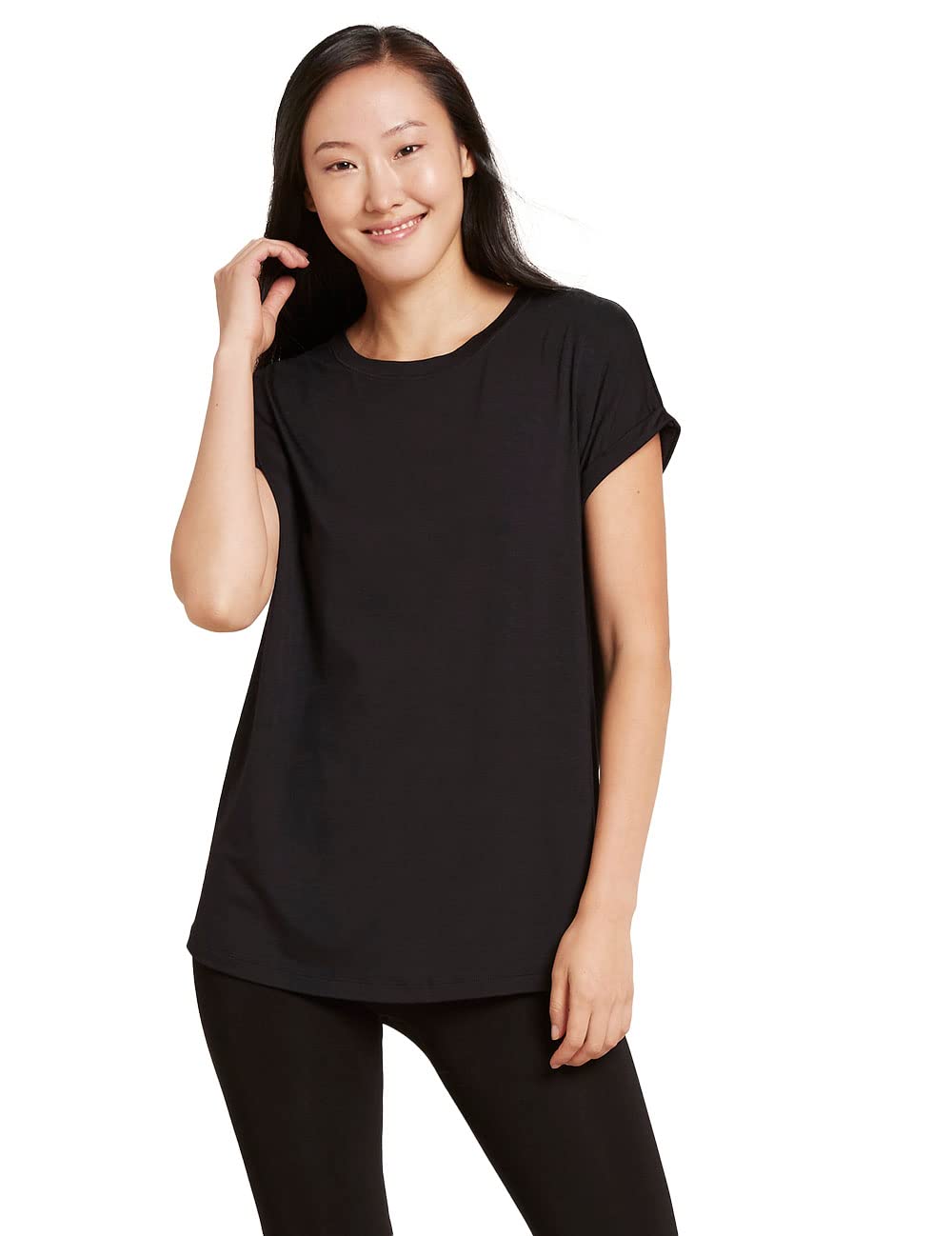自宅でゆったりする時、あるいはお気に入りのジーンズと組み合わせた気軽なカジュアルスタイルに最適な、この上なく柔らかなラウンジウェアは、まるで第二の肌のよう。ゆるいカーブを描く襟ぐりと、ロールアップのカフスリーブ、裾・後身頃・ネックバンドのカバーステッチのディテールが特長です。