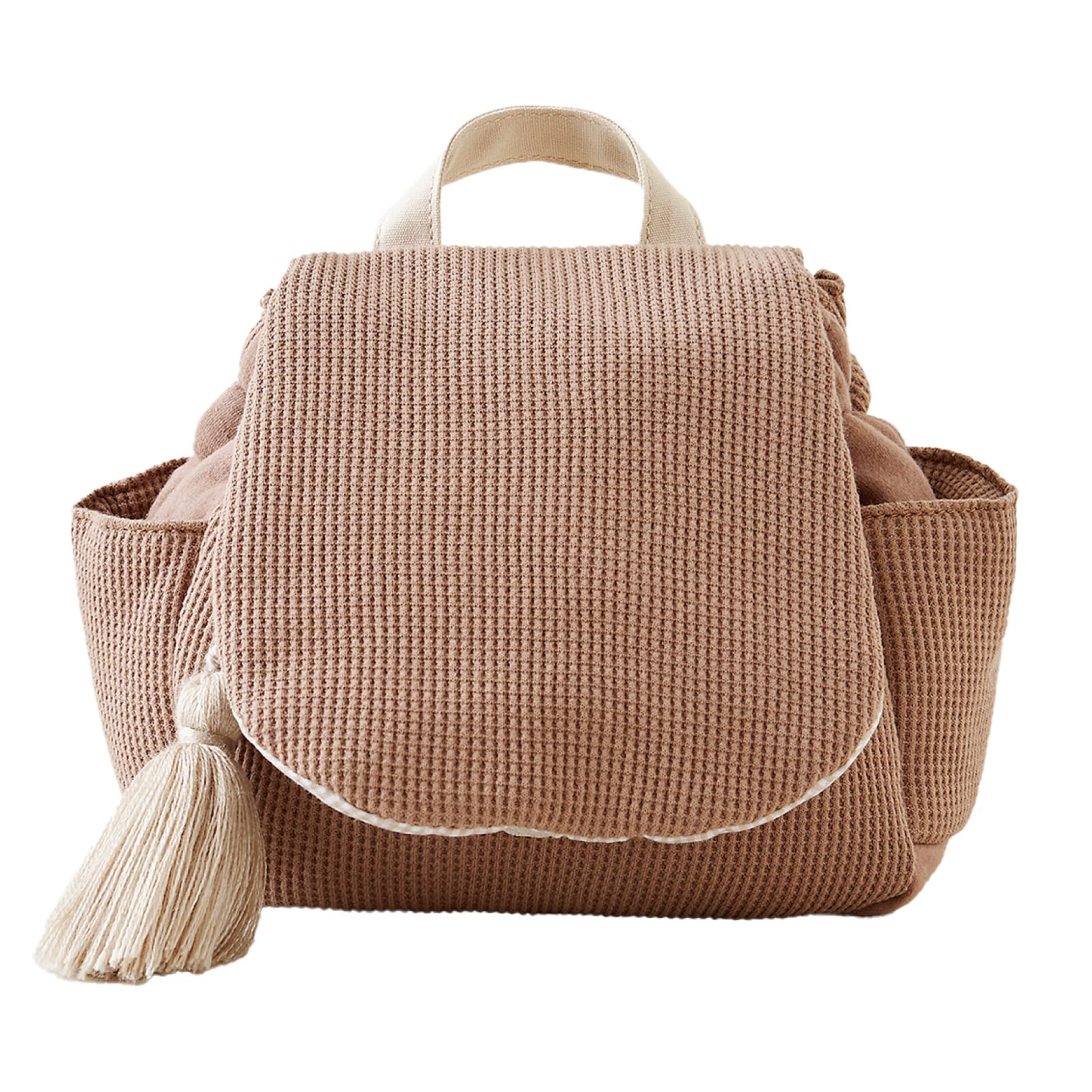 柔らかい素材を使用した「ふわもこベビーリュック」。 「ふわふわ」の素材感と「ころん」としたシルエットで赤ちゃんらしいリュックに仕上げました。 背負った姿は写真に収めたくなる愛らしさです。 小さいお子様でも自分で開けられる柔らかい面テープを使用。 裏地はチェック柄で開けても可愛いデザインです。 付属のタッセルストラップは取り外し可能で、好きなおもちゃに付け替えることも可能です。