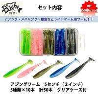 Bucht シャッドテールワーム 2センチ(5センチ) 5カラー×10本 計50本セット。 クリアカラーから定番カラーまでどんなロケーションや時合にも合う5カラー。 テールが生み出す美波動でアピール力アップ!! バス釣り・アジング・メバリング・根魚まで何でも対応の万能ワーム! ワームやジグヘッドを収納しやすいワームケース付