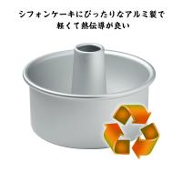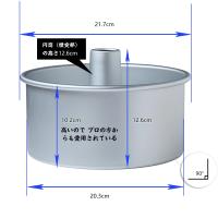 軽く、熱伝導のよいアルミニウムで作られたシフォンケーキ型とデコレーションケーキ焼型20cmです。素材・材質:アルミニウム(アルマイト加工) サイズ:(約)上部内直径20.3cm、底内径20.3cm、型の高さ10.2cm、円筒(煙突部)の高さ12.6cm 生産国:中国