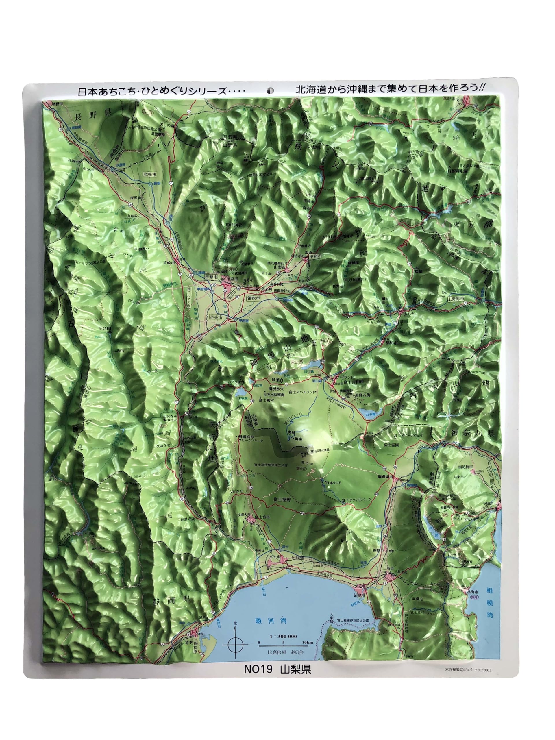 県別シリーズ「山梨県」の立体地図です。 南に富士山、西に赤石山脈(南アルプス)、北に八ヶ岳、東に奥秩父山地など、海抜2000mを超す山々に囲まれる。県別シリーズの一番人気の立体地図です。■サイズ:330×405(mm)■縮尺S=1/300,000 高さ倍率3倍