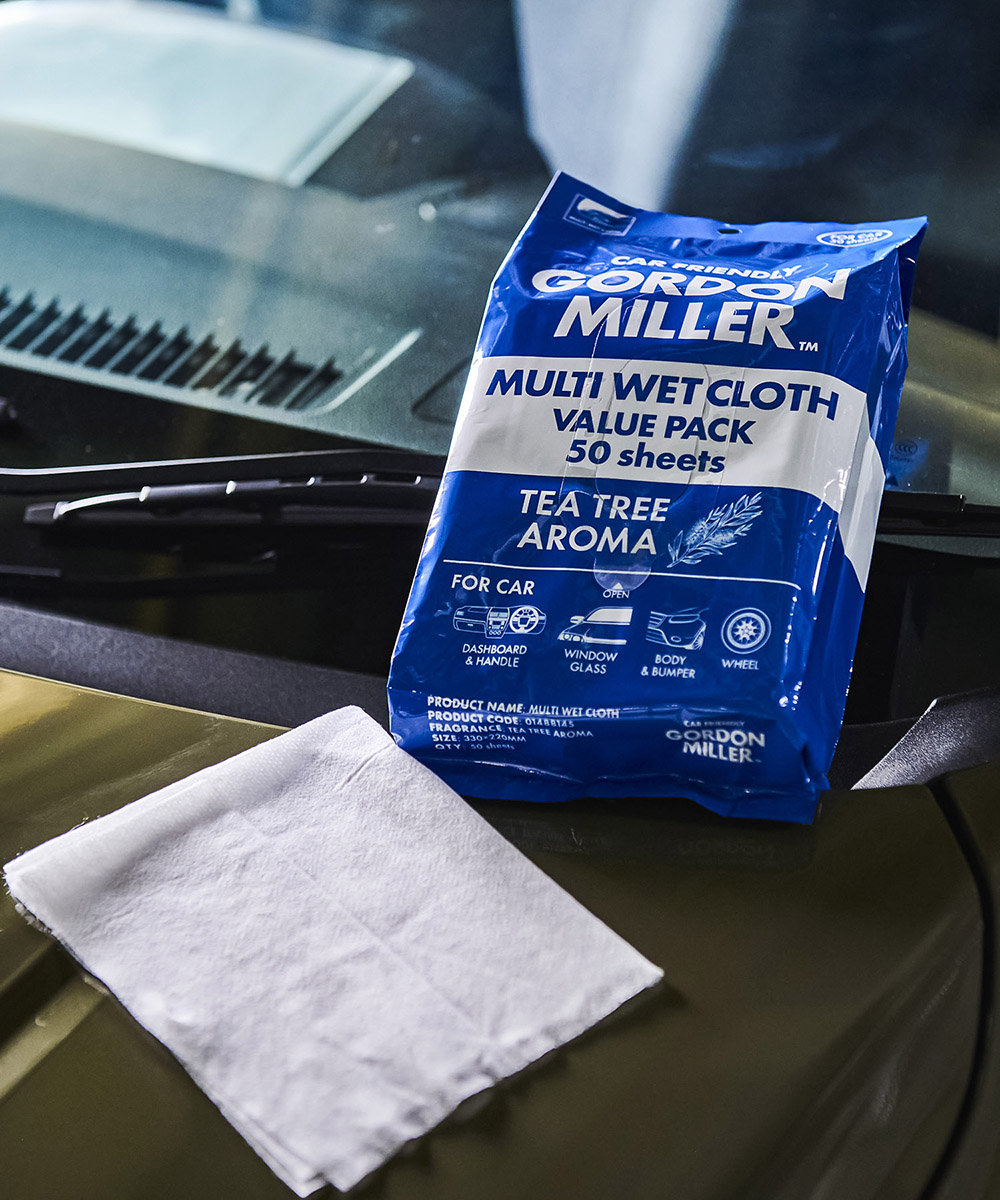 ハンドル、ダッシュボードの車内汚れや窓ガラスの内側、外側、ボディ、ホイールに至るまでクルマ丸ごと拭き取れるマルチウェットクロスにアロマ(ティーツリー)の香りがプラス。