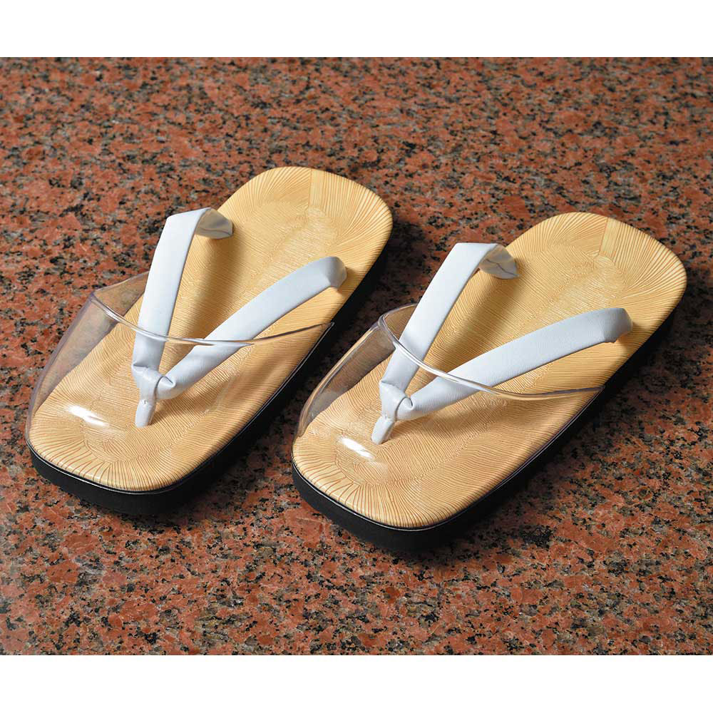 草履の底はスポンジ層と地面に接する部分に天然ゴムを使用した2層仕立て。また、ウレタン底で発生していた加水分解による底の破損・損耗がなく耐久性・耐水性に優れた底素材(天然ゴム)を採用。