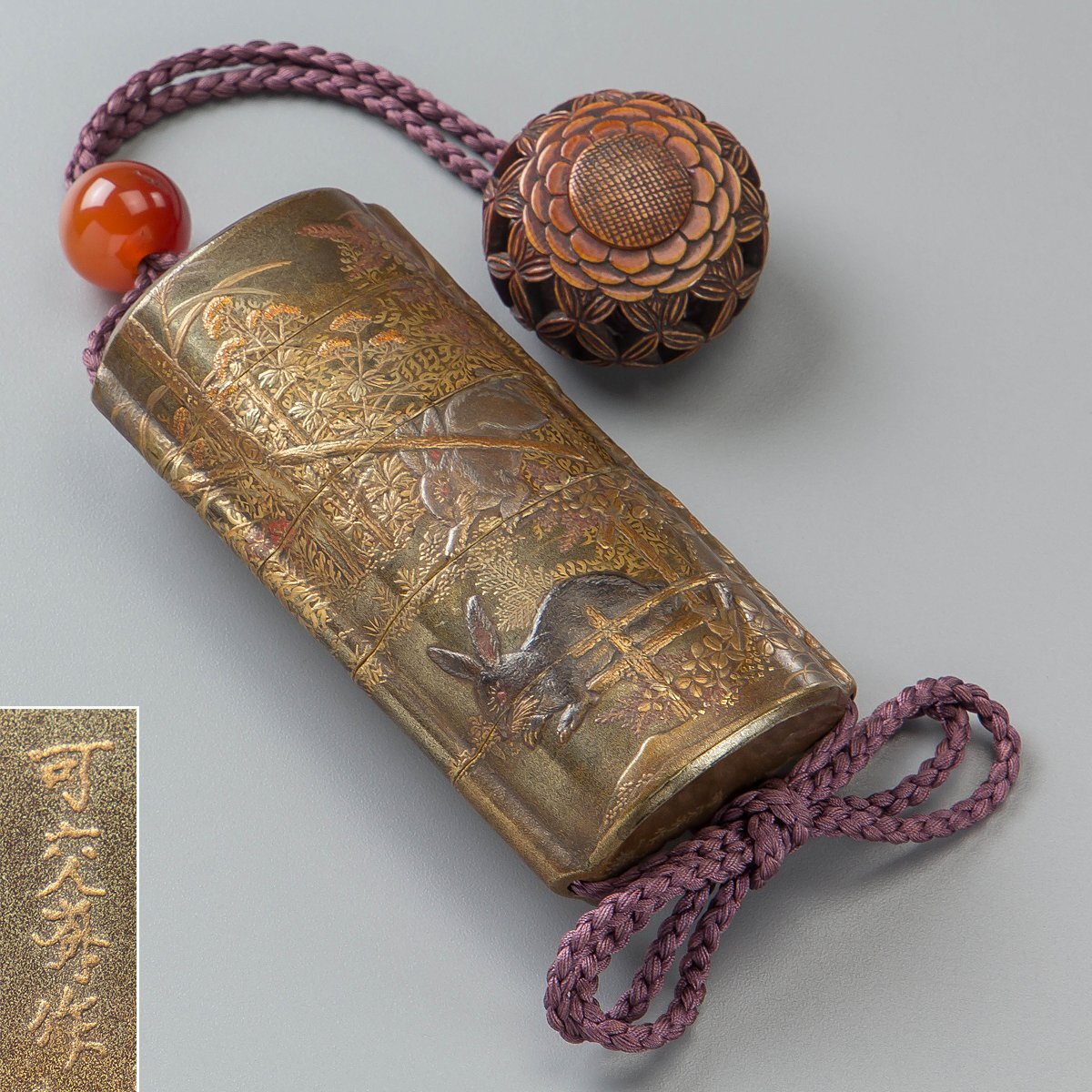 | 商品説明 | | 品名 | 白井可交斎 作 木製金漆 兎秋草花高蒔絵梨地印籠 菊透彫饅頭根付 瑪瑙緒締玉 | | 寸法 | 印籠・・・縦9.8cm 横4.8cm 厚2.73cm 緒締・・・直径1.67cm 根付・・・直径3.6cm 厚2.25cm 総重量72g ※寸法に若干の誤差が生じます。ご承知下さい。 | | 状態 | 印籠内ヒビ、緒締小傷。 | | 略歴 | | | 備考 | | | 補足 | | | 送料 | ■ゆうパック60サイズ(詳細は以下の〈配送方法〉を参照して下さい) ※形状・性質が異なるものは同梱をお断りさせていただく場合がございます。同梱の場合、サイズ変更により表示される送料の金額を修正させていただく場合がございます。予めご了承いただきますようお願い致します。