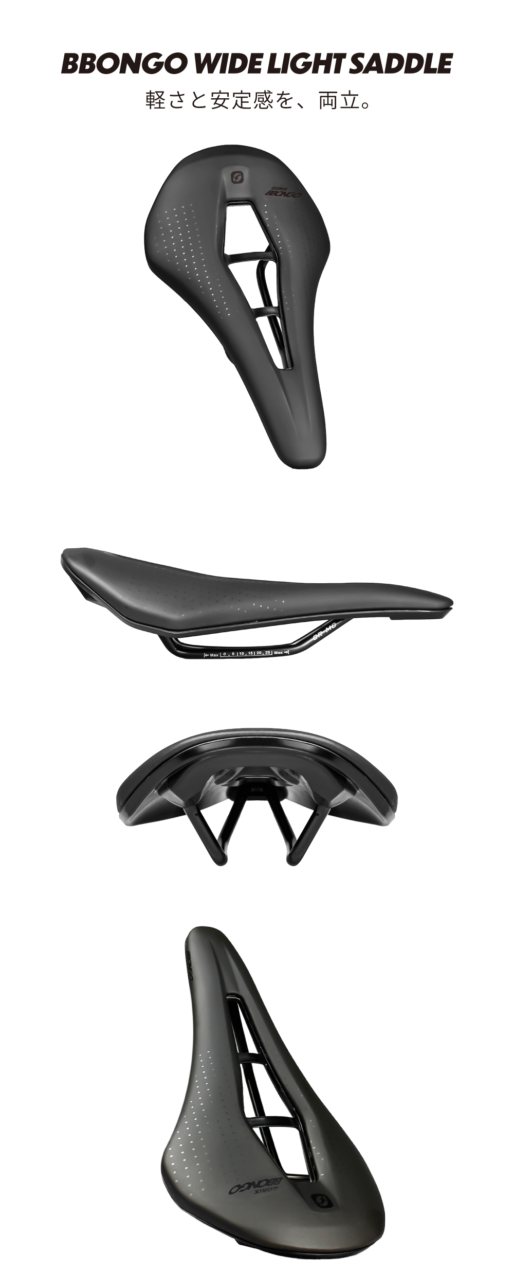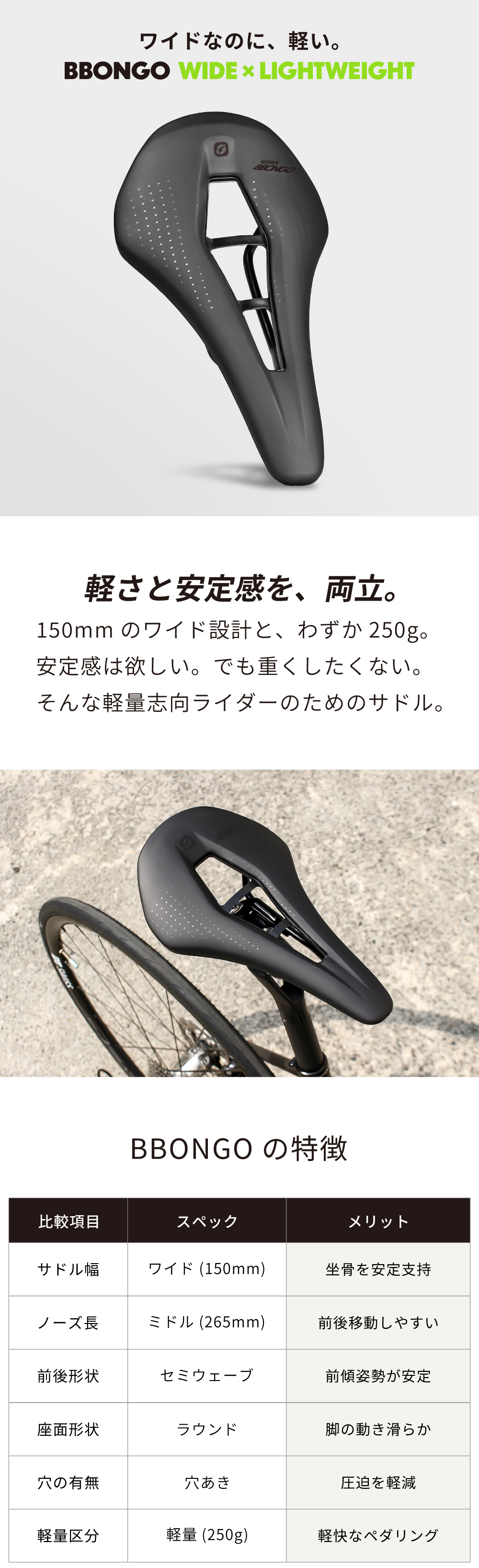 GORIX BBONGOは、150mmのワイド設計による安定感と、わずか250gの軽量性を両立した自転車用サドルです。