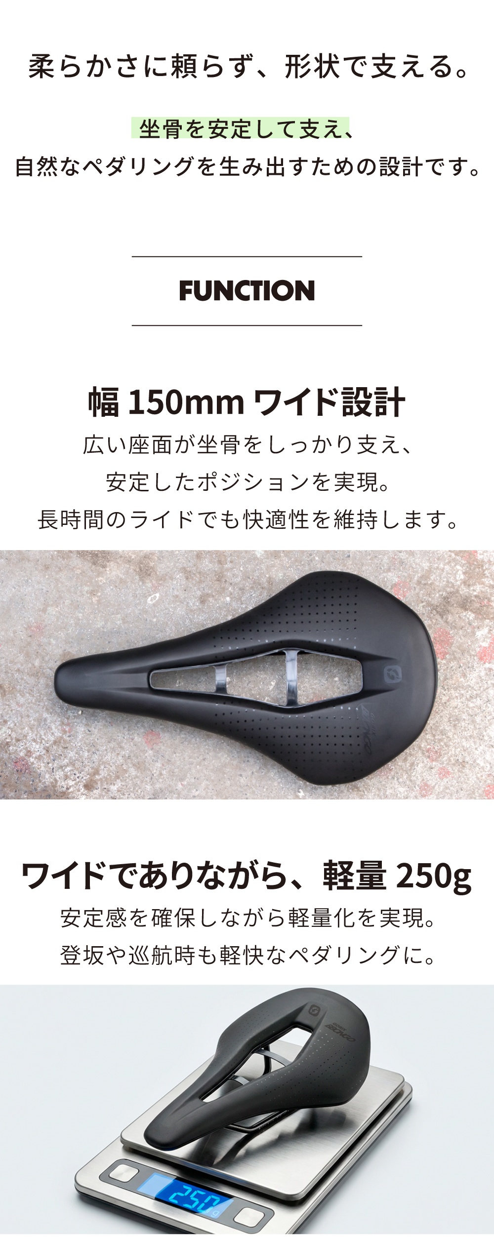 【150mmワイド設計】坐骨をしっかり支える幅広座面により、安定したポジションを維持。長時間のライドでも快適性を保ちます。