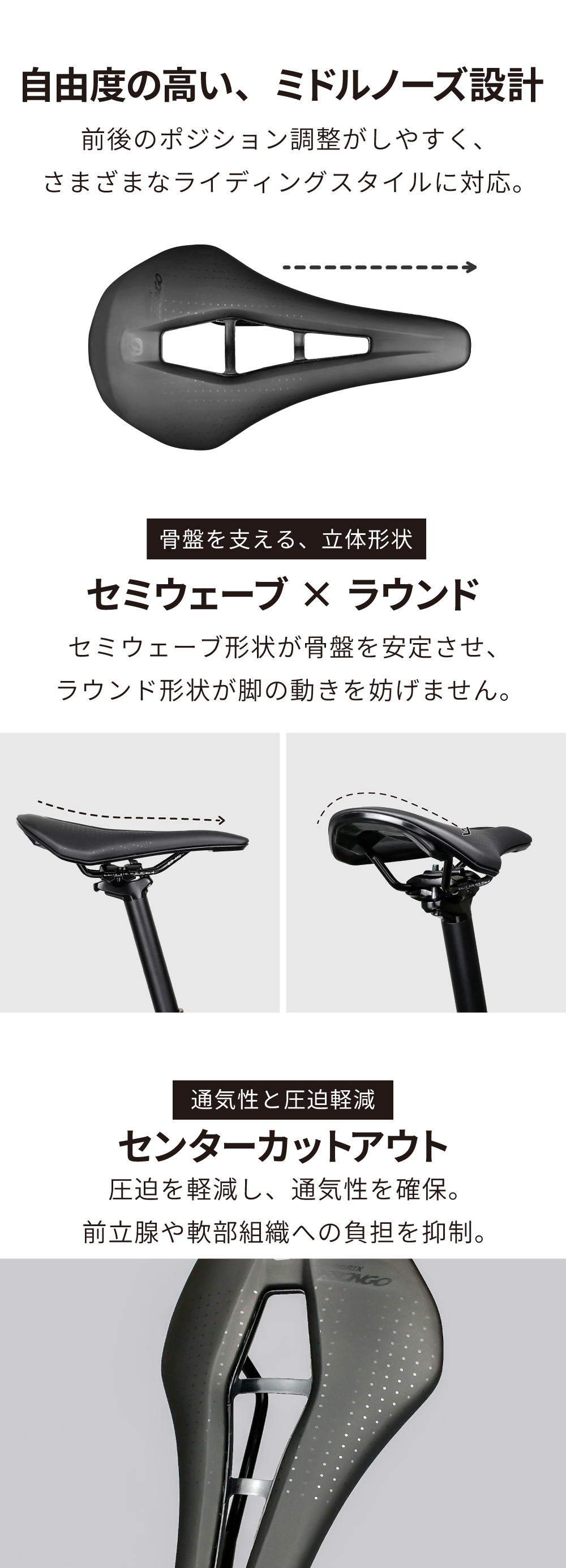 センターカットアウト構造が前立腺周辺への圧迫を軽減し、長時間のライドでも負担を抑えます。