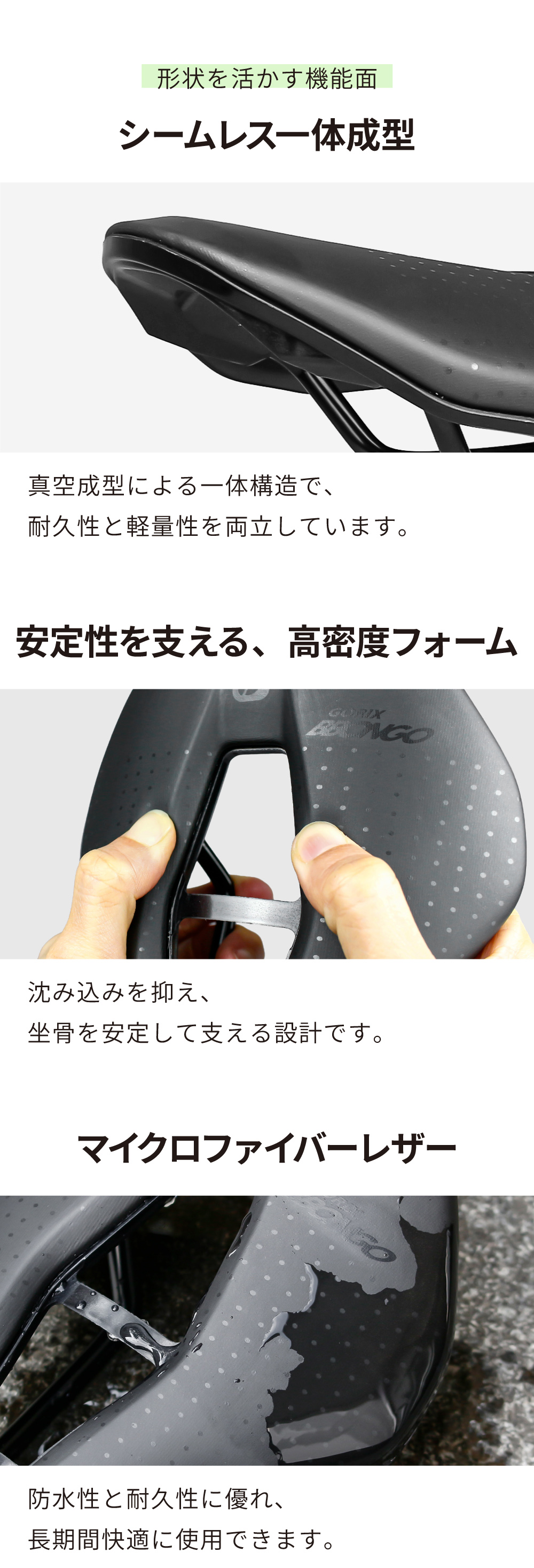坐骨をしっかり支える形状により、安定したペダリングと快適な座り心地を実現。