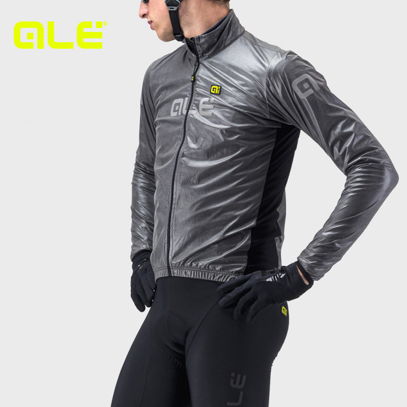 超高反発の防風素材を採用したこのジャケットは、低照度下での視認性をもち、ヘッドライトに照らされると発光する微細なガラス球を埋め込んでいます。