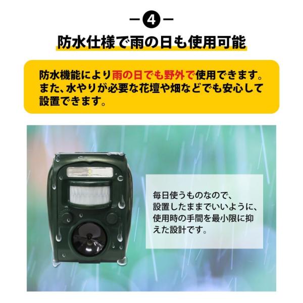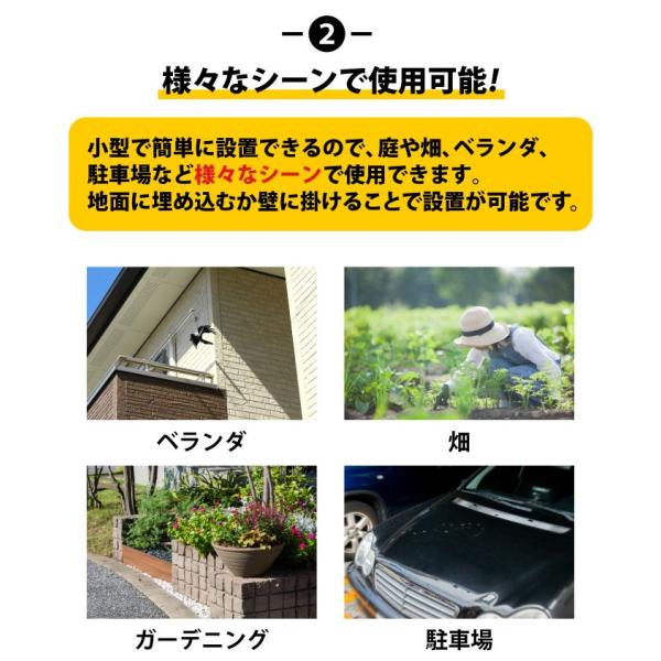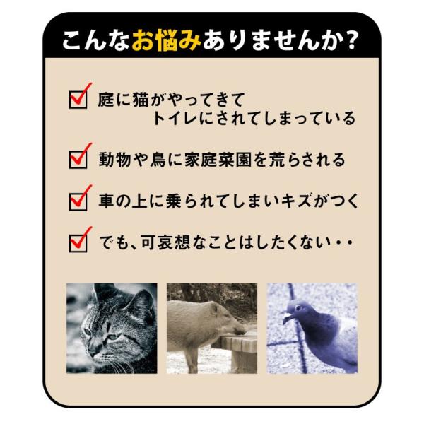 動物の動きを感知し不快な超音波・LEDフラッシュ・警告音を発して動物を追い払います。