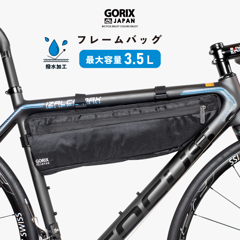 フレームの空きスペースを有効活用。フレームバッグは長めのサイズで長い携帯ポンプなども収納可能。