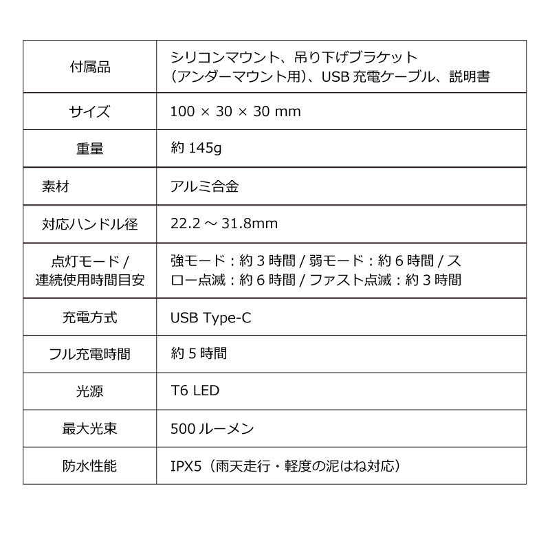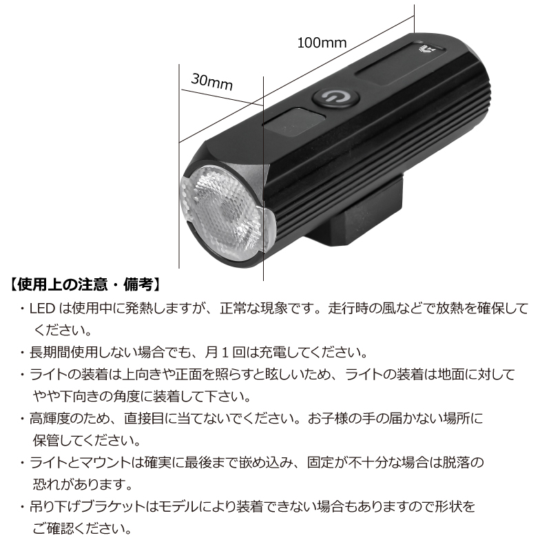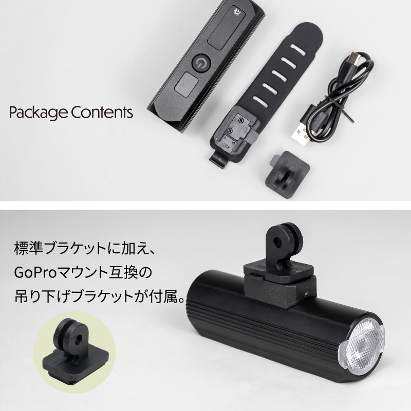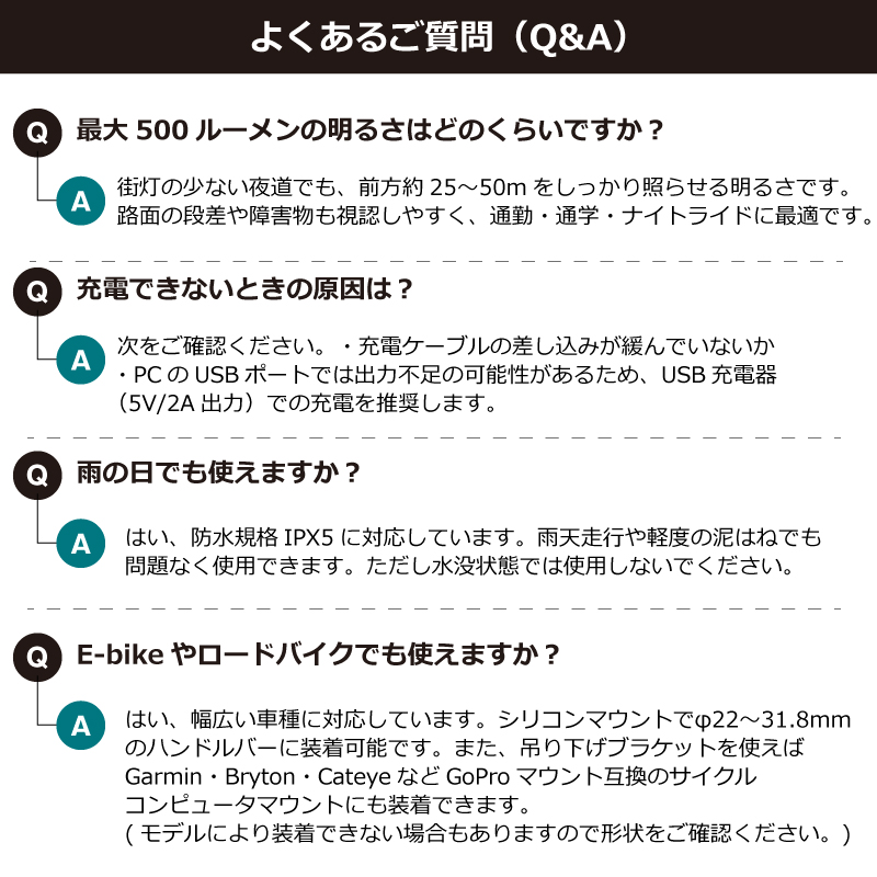 本製品は、明るさ500ルーメンの実用的な性能と、高い利便性・安全性を両立した次世代フロントライトです。