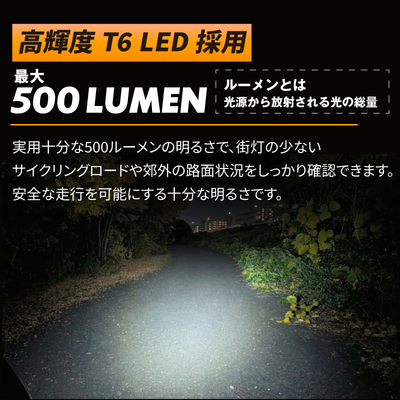 ●500ルーメン:通勤・郊外のナイトライドに最適な明るさを確保。