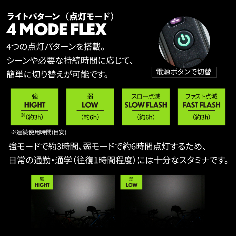 ●強モード3時間:日常の往復走行に十分な安心のランタイム。