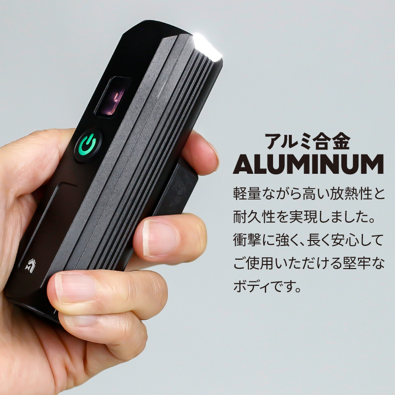 ●アルミ合金製:耐久性が高く、IPX5防水で雨天走行にも対応。