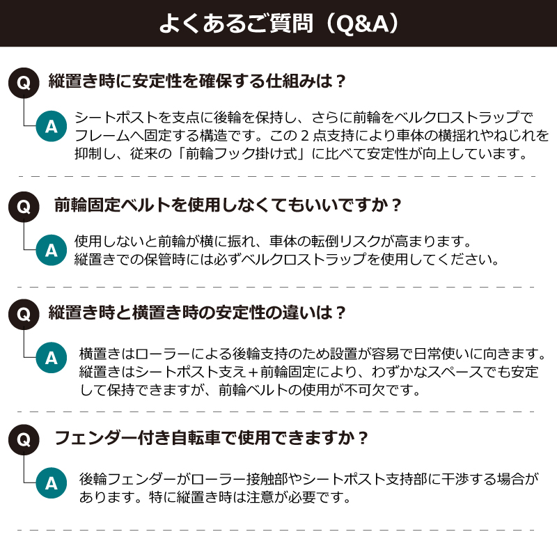 従来の縦置きスタンドは前輪をフックで一点支持するものが多く、重心が高くなりがちで横揺れや転倒のリスクがありました。本製品は、シートポストと後輪ローラー、前輪固定ベルトの3点で車体を保持。車体の重心に近いシートポストを広い面で支えるため、回転力を大幅に低減し、ハンドル方向への小さい外力に対しても高い抵抗力を発揮。縦置き時でも倒れにくく、愛車を傷つける不安が解消されます。