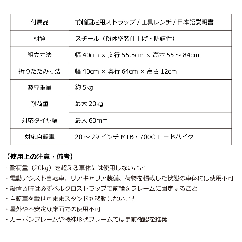 ・耐荷重(20kg)を超える車体には使用しないこと