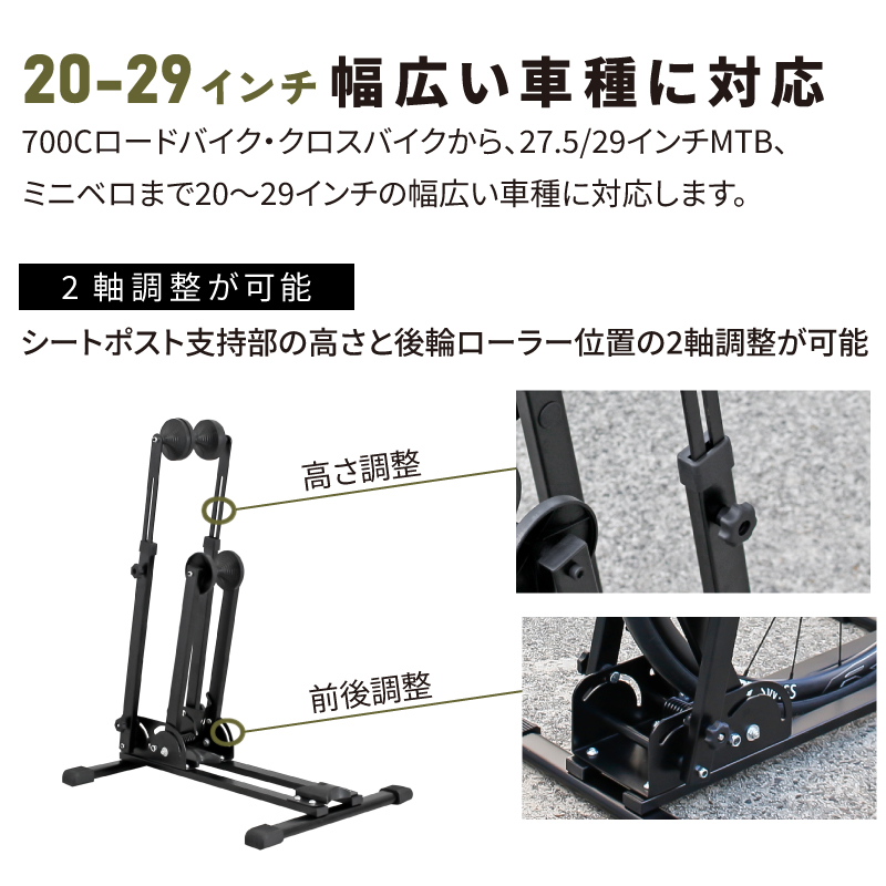 【幅広い車種に対応】20-29インチ、最大タイヤ幅60mmまでフィットシートポスト支持部の高さと後輪ローラー位置の2軸調整が可能。700Cロードバイク・クロスバイクから、27.5/29インチMTB、ミニベロまで20〜29インチの幅広い車種に対応します。タイヤ幅も最大60mmまで対応するため、複数台の愛車を持つユーザーや将来の買い替え予定がある方でも長くお使いいただけます。