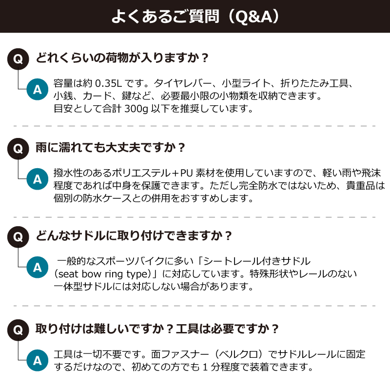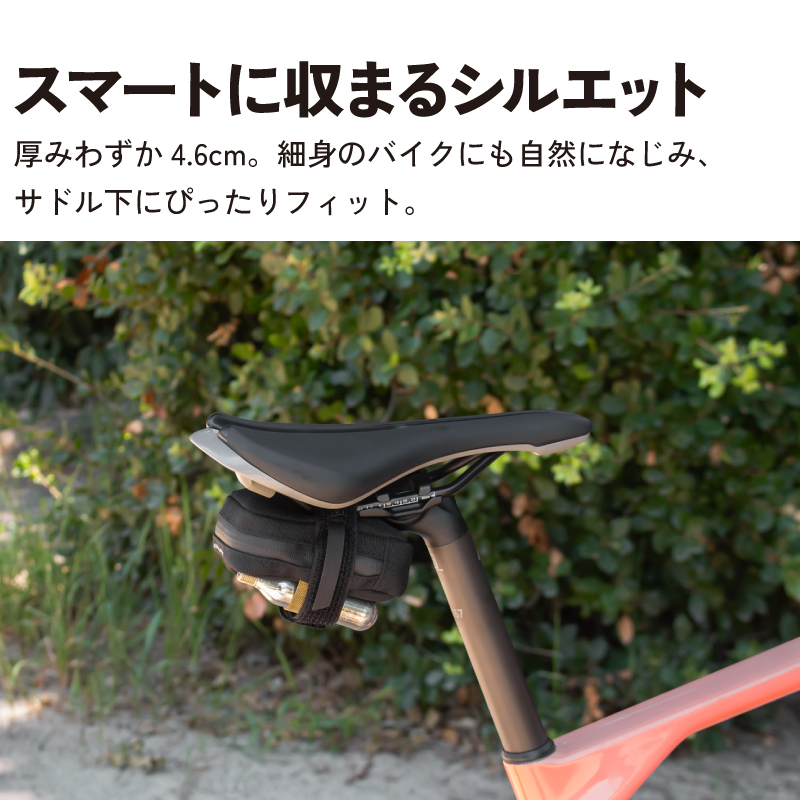 【最小限収納に特化したミニサドルバッグ】CO2ボンベ一式やパンク修理パッチ、タイヤレバー、カード、小銭など、緊急時に必要な小物だけをスマートに持ち運べる0.3Lサイズ。ミニマリスト派にぴったり。