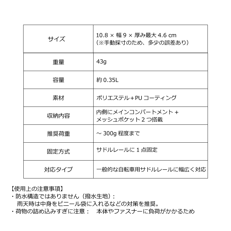 ・防水構造ではありません(撥水生地): 雨天時は中身をビニール袋に入れるなどの対策を推奨。