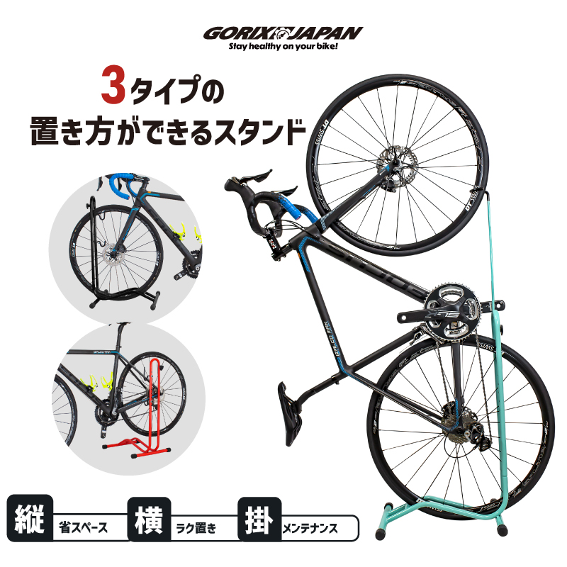 ロードバイク・マウンテンバイク・クロスバイク・ミニベロに最適なホイール差込式スタンドです。タテ置き、ヨコ置きどちらにも対応。