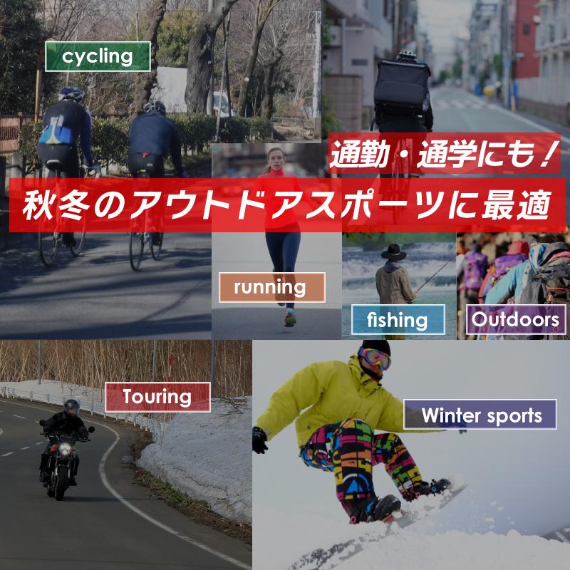 自転車のサイクリングやバイクなどの通勤通学や、釣り、登山、スノボー、スキーなどの
