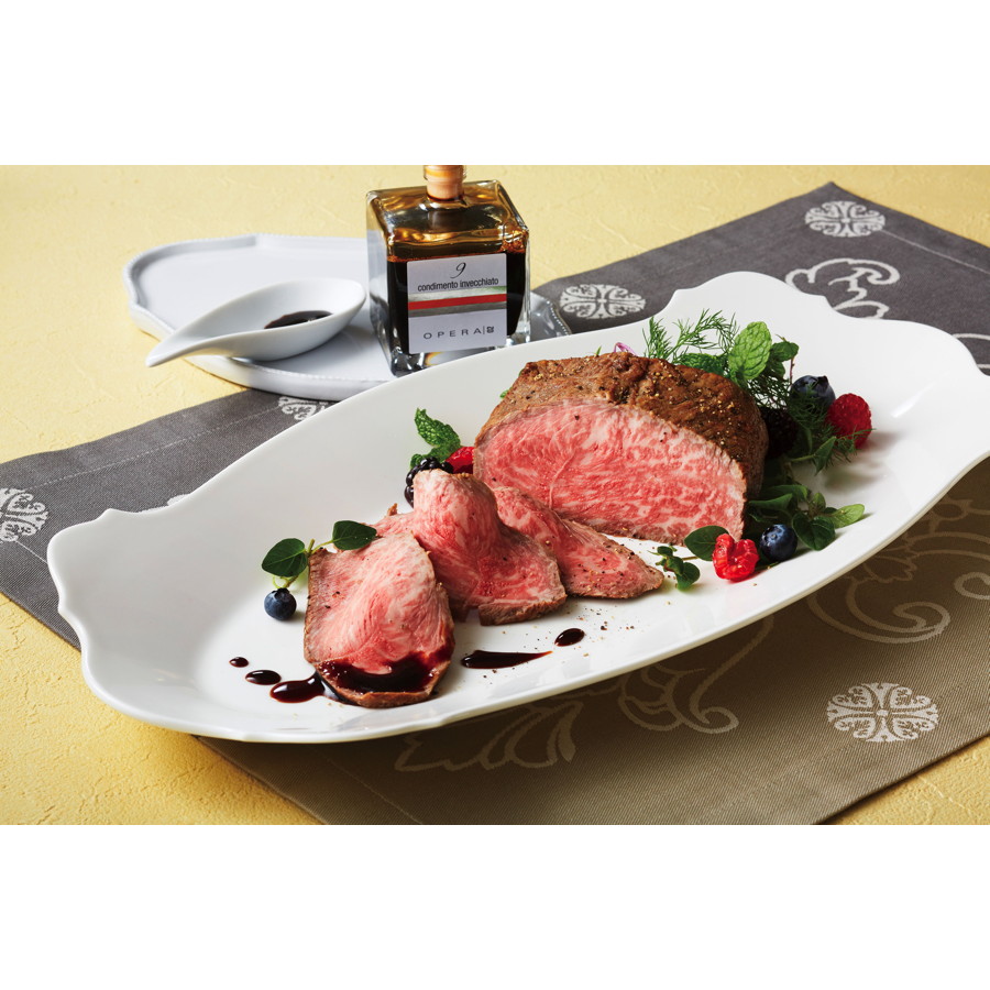 ほどよい赤身の甘さが自慢の神戸牛を使用。北イタリア・レビザーノ村の丘陵でぶどうを栽培、伝統的な製法で作られたバルサミコ酢を、神戸牛のローストビーフとご一緒にどうぞ。