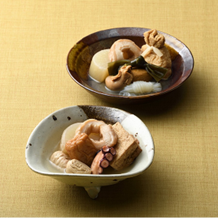 | 内容量 | 金沢おでん 黄330g(梅貝・つみれ・大根・車麩・野菜巾着・結びこんにゃく・結び昆布)・金沢おでん 赤350g(たこぶつ・大根・車麩・角揚げ・ごぼう天各1個、手毬湯葉2個)×各2 | |