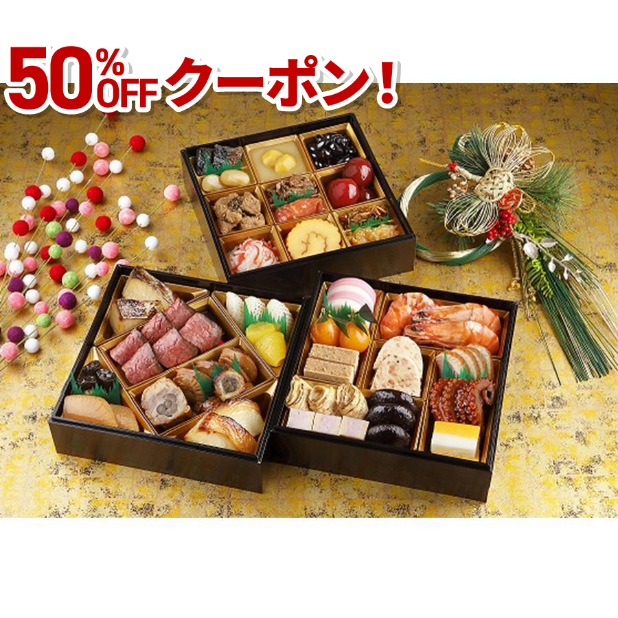 | 内容量 | 和洋中三段重 約3人前33品目 一の重:黒豆、栗きんとん、紅白なます、鱈の子旨煮、伊達巻、赤梅甘露煮、牛肉山椒煮、紅鮭糀漬、海月酢、松前漬、白花豆、鰊土佐煮 二の重:帆立生姜煮、鶏八幡巻、穴子八幡巻、数の子鼈甲漬、一口昆布巻、鰈西京焼、鰆西京焼、松笠烏賊白焼、編笠柚子、国産牛ローストビーフ、ローストビーフソース 三の重:鮭テリーヌ、海老芝煮、焼目湯葉含め煮、海老高野豆腐煮、干椎茸甘露煮、紅白小袖蒲鉾、金柑甘露煮、鶏松風、合鴨燻製、小蛸、錦玉子 | |