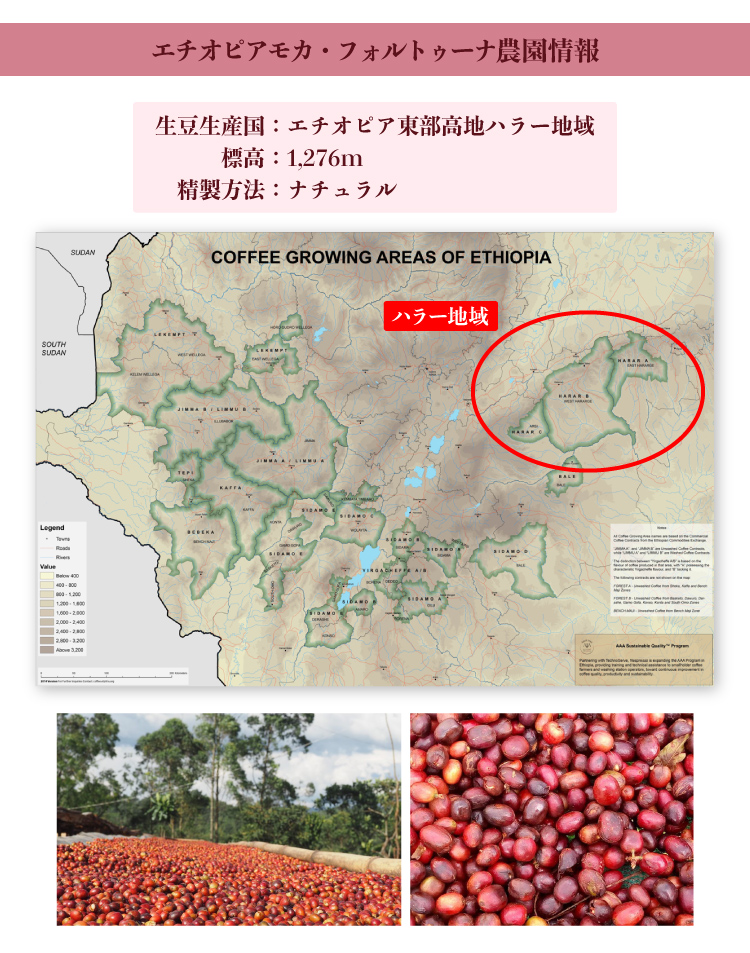 エチオピア東部高地のハラー地域は、コーヒー栽培発祥の地のひとつとして知られる歴史あるエリアです。古くから受け継がれてきた丘陵地帯の豊かな土壌と独特の気候風土が、個性あふれる風味を育みます。果肉をつけたまま天日乾燥させる伝統的なナチュラル精選により生まれる、ハラーコーヒーならではの味わいを感じることができます。