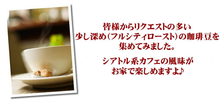 皆様からリクエストの多い少し深めやコクのある珈琲豆を集めてみました。根強い人気のシアトル系カフェの風味をお家で楽しめます♪スイーツにも相性バツグン!家カフェに最適な珈琲豆をたっぷり約200杯分(2kg)をお届けします。酸味が無く香り高い、少し深めやコクのある珈琲がお好みの方、是非どうぞ。
