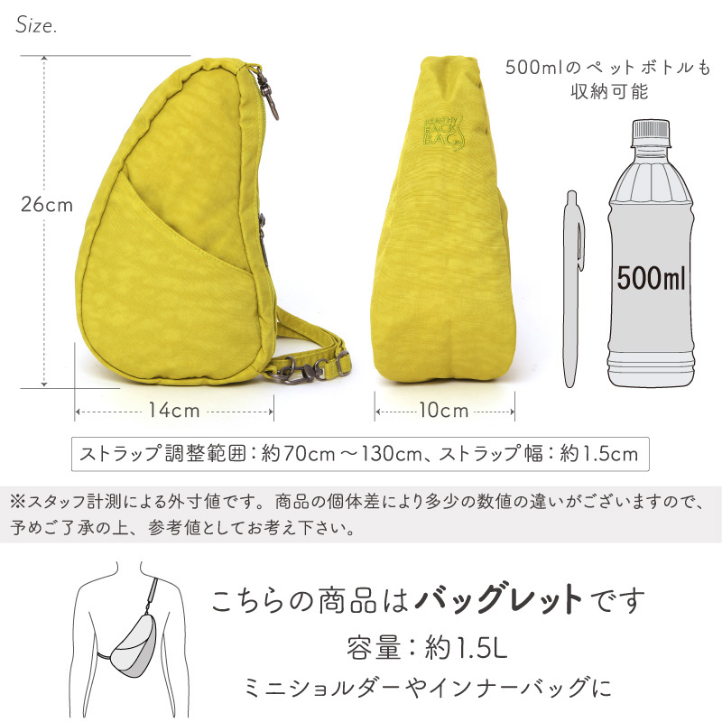 | ■商品名 ヘルシーバックバッグ テクスチャードナイロ バッグレット【HEALTHY BACK BAG Textured Nylon Baglett】 ■素材 表地:ナイロン、裏地:リサイクルポリエステル ■カラー ブラック、ブルーナイト、ヴィンテージインディゴ、アメジスト、ブラックベリー、ルビー、マルベリー、ローズヒップ、ガーネット、パンプキン、ハーベスト、リモンチェロ、エメラルド、カプリブルー、ダークティール、エバーグリーン、シーグラス、シャンブレー、ロケットグレー、キャビア、グラファイト、セサミ、シエラ ■仕様 アウターポケット:オープンポケット1個、ファスナーポケット1個 インナーポケット:オープンポケット1個、キーフック1個 ■サイズ(約) 本体サイズ:縦26cm×横14cm×マチ10cm ストラップ全長:最長130cm、最短70cm(調節可能)、ストラップ幅:約1.5cm ■容量 1.5リットル ■重さ 約120g ■生産国 中国(企画/イギリス) ■お手入れ方法 洗濯機洗い可(弱・ネット) ■注意点 ※こちらのブランドは、もともと「ameribag(アメリバッグ)」という名称でしたが、ブランド名が変わり「ヘルシーバックバッグ」という名称になりました。 ※ご利用のモニター環境により、実物の色と異なって見える場合がございます。 ※商品の仕様は、予告なく変更する場合がございます。 ※輸入品のため、パッケージにスレ・キズ等がある場合がございます。 ※カラー・ロットにより細部のデザイン・色が多少異なる場合があります。 ※上記ご了承の上お買い上げください。 |