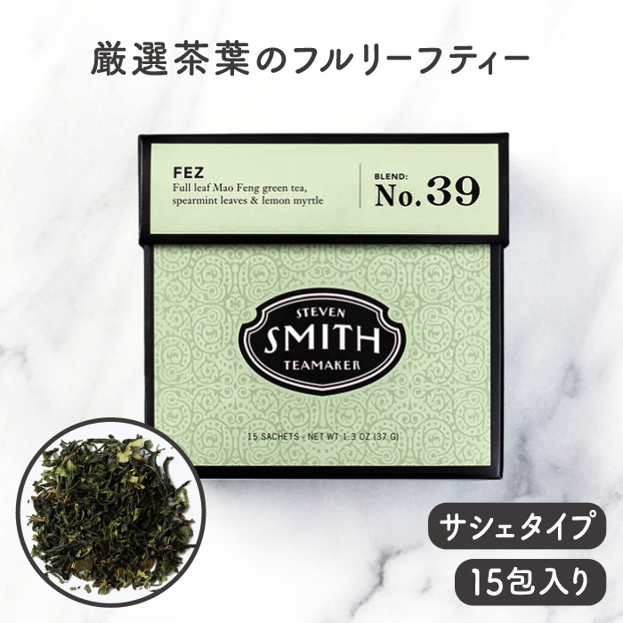 | 米国茶業界のカリスマ、スティーブン・スミス氏のティーブランド 厳選した茶葉だけを集め、ブレンドしたフルリーフティー こちらの「NO 39 FEZ フェズ」は、希少な中国産の緑茶とアメリカ北西部産の香り高いスペアミントの組み合わせにオーストラリア産のレモンマートルの香りがかすかに漂うブレンドは古き良きモロッコを思い起こさせます。親しい友人と語り合う夕べにふさわしいお茶です。 ※FEZとは・・イスラムの男性がかぶっているコップをひっくり返したような帽子 TASTING NOTES: 瓜、レモン、ミント 一杯から飲みやすい個包装、手軽なサシェ(ティーバッグ)タイプ。おしゃれなBOXパッケージなので、ちょっとしたギフトにもオススメです。 アメリカ・ポートランドに拠点を持つスティーブンスミスティーメーカーは、米国茶業界で40年以上のキャリアを持つ、スティーブンスミス氏が、お茶をひとつ上の芸術として形づくりたいという想いから立ち上げた高品質なフルリーフティーブランドです |