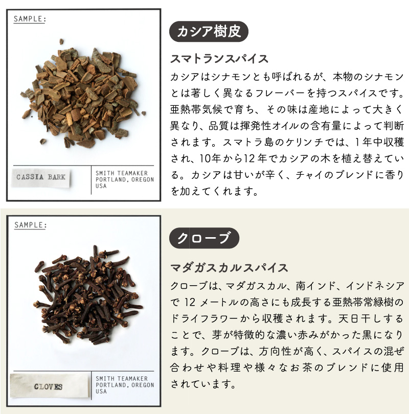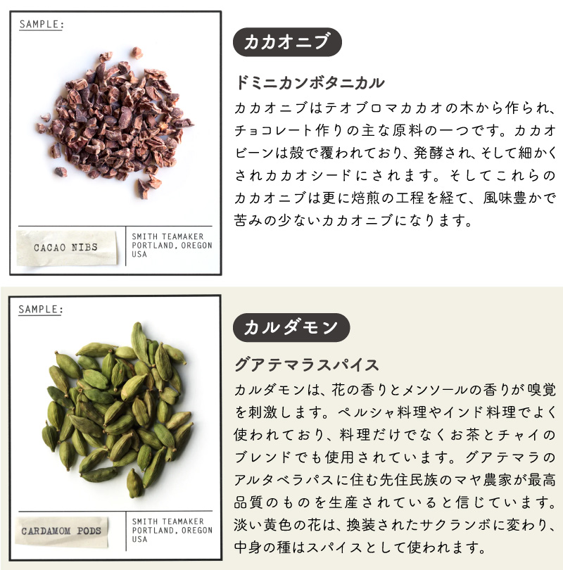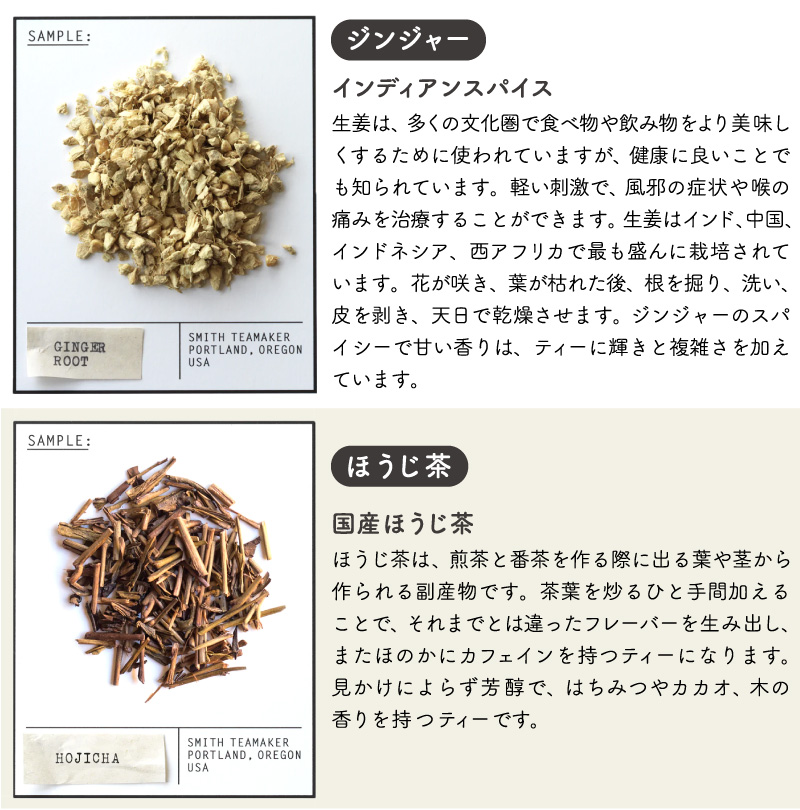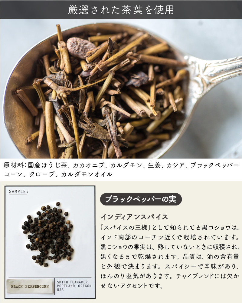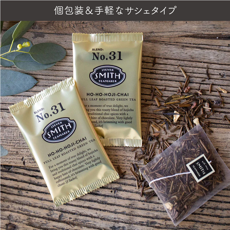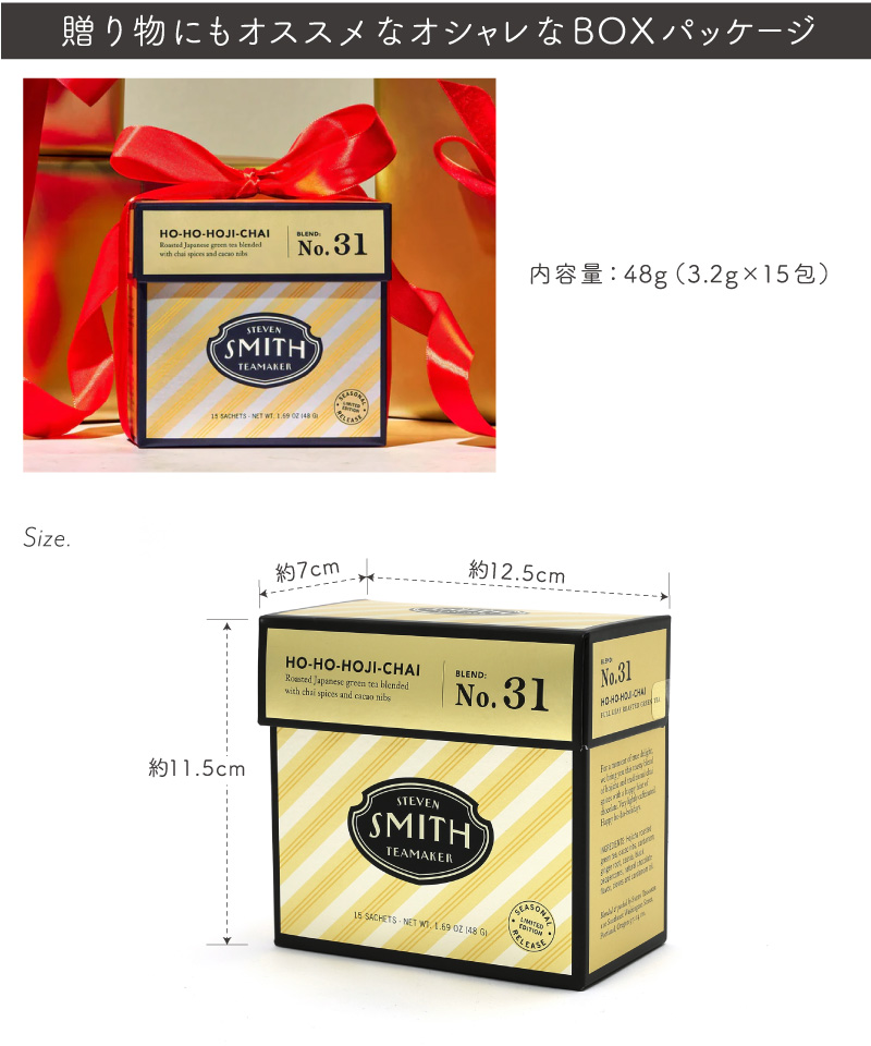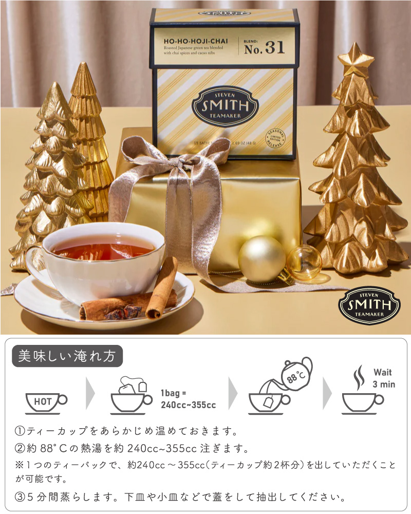 | こちらの「HO・HO・ほうじチャイ」は、はちみつやウッドの香りを連想させる鹿児島産のほうじ茶に、インディアンチャイに 使用される伝統的なスパイスをブレンド。焙煎特有の深みのある味わいとスパイスが交わり、そしてカカオニブをトッピングすることで、柔らかな味わいが特長のカフェインレスなチャイとして完成した、ホリデーシーズン限定ブレンドです。 TASTING NOTES: チョコレート、クローブ、ストロープワッフル 一杯から飲みやすい個包装、手軽なサシェ(ティーバッグ)タイプ。おしゃれなBOXパッケージなので、ちょっとしたギフトにもオススメです。 アメリカ・ポートランドに拠点を持つスティーブンスミスティーメーカーは、米国茶業界で40年以上のキャリアを持つ、スティーブンスミス氏が、お茶をひとつ上の芸術として形づくりたいという想いから立ち上げた高品質なフルリーフティーブランドです。 |