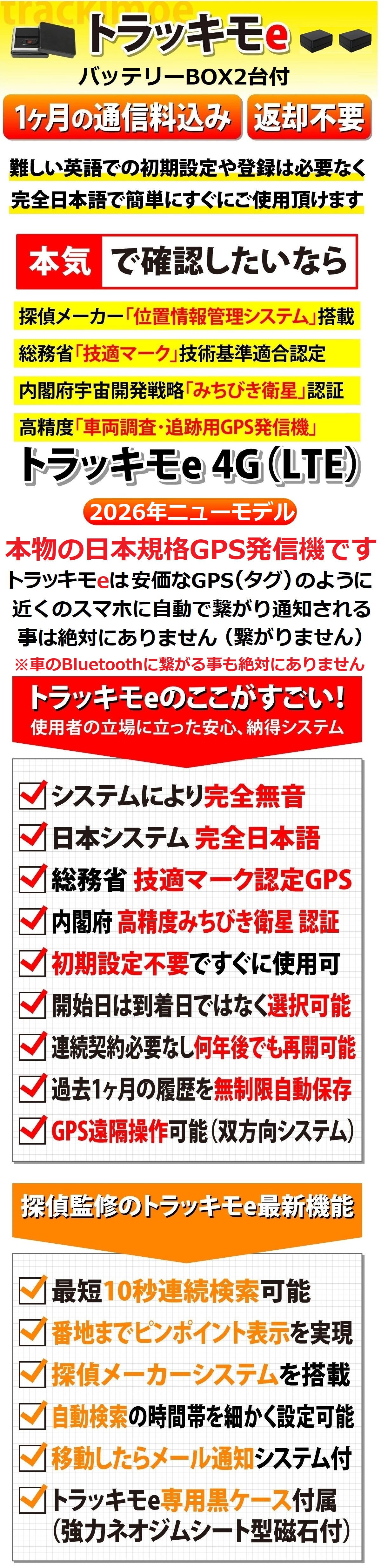 【商品説明】●トラッキモe GPS発信機1台+バッテリーBOX2台
